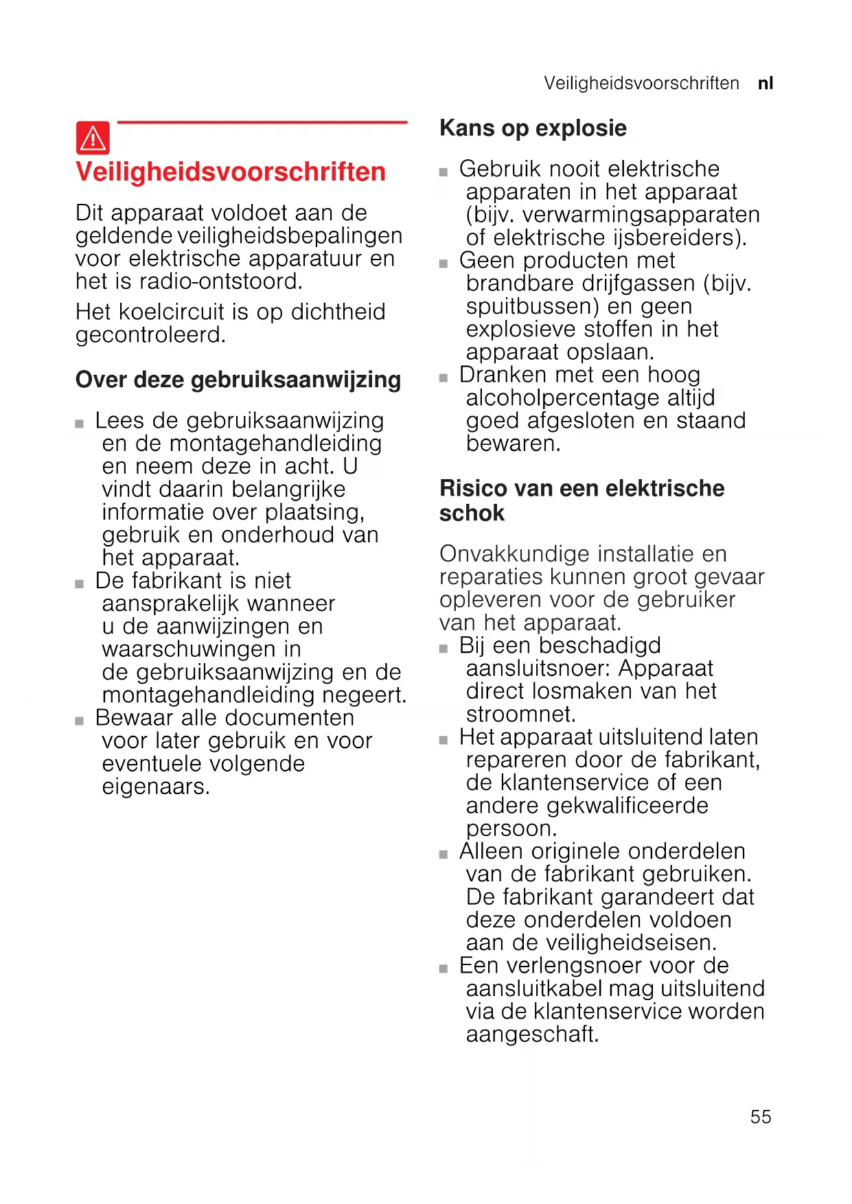 Veiligheidsvoorschriften Veiligheidsvoorschriften Dit apparaat voldoet aan de geldende veiligheidsbepalingen voor elektrische apparatuur en het is radio-ontstoord. Het koelcircuit is op dichtheid gecontroleerd. Over deze gebruiksaanwijzing ■ Lees de gebruiksaanwijzing en de montagehandleiding en neem deze in acht. U vindt daarin belangrijke informatie over plaatsing, gebruik en onderhoud van het apparaat. ■ De fabrikant is niet aansprakelijk wanneer u de aanwijzingen en waarschuwingen in de gebruiksaanwijzing en de montagehandleiding negeert. ■ Bewaar alle documenten voor later gebruik en voor eventuele volgende eigenaars. Kans op explosie ■ Gebruik nooit elektrische apparaten in het apparaat (bijv. verwarmingsapparaten of elektrische ijsbereiders). ■ Geen producten met brandbare drijfgassen (bijv. spuitbussen) en geen explosieve stoffen in het apparaat opslaan. ■ Dranken met een hoog alcoholpercentage altijd goed afgesloten en staand bewaren. Risico van een elektrische schok Onvakkundige installatie en reparaties kunnen groot gevaar opleveren voor de gebruiker van het apparaat. ■ Bij een beschadigd aansluitsnoer: Apparaat direct losmaken van het stroomnet. ■ Het apparaat uitsluitend laten repareren door de fabrikant, de klantenservice of een andere gekwalificeerde persoon. ■ Alleen originele onderdelen van de fabrikant gebruiken. De fabrikant garandeert dat deze onderdelen voldoen aan de veiligheidseisen. ■ Een verlengsnoer voor de aansluitkabel mag uitsluitend via de klantenservice worden aangeschaft.nl Veiligheidsvoorschriften