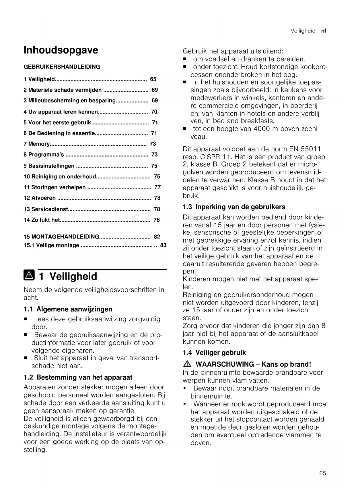 1 Veiligheid Neem de volgende veiligheidsvoorschriften in acht. 1.1 Algemene aanwijzingen ¡ Lees deze gebruiksaanwijzing zorgvuldig door. ¡ Bewaar de gebruiksaanwijzing en de pro- ductinformatie voor later gebruik of voor volgende eigenaren. ¡ Sluit het apparaat in geval van transport- schade niet aan. 1.2 Bestemming van het apparaat Apparaten zonder stekker mogen alleen door geschoold personeel worden aangesloten. Bij schade door een verkeerde aansluiting kunt u geen aanspraak maken op garantie. De veiligheid is alleen gewaarborgd bij een deskundige montage volgens de montage- handleiding. De installateur is verantwoordelijk voor een goede werking op de plaats van op- stelling. Gebruik het apparaat uitsluitend: ¡ om voedsel en dranken te bereiden. ¡ onder toezicht. Houd kortstondige kookpro- cessen ononderbroken in het oog. ¡ In het huishouden en soortgelijke toepas- singen zoals bijvoorbeeld: in keukens voor medewerkers in winkels, kantoren en ande- re commerciële omgevingen, in boerderij- en; van klanten in hotels en andere verblij- ven, in bed and breakfasts. ¡ tot een hoogte van 4000m boven zeeni- veau. Dit apparaat voldoet aan de norm EN55011 resp. CISPR11. Het is een product van groep 2, klasse B. Groep 2 betekent dat er micro- golven worden geproduceerd om levensmid- delen te verwarmen. Klasse B houdt in dat het apparaat geschikt is voor huishoudelijk ge- bruik. 1.3 Inperking van de gebruikers Dit apparaat kan worden bediend door kinde- ren vanaf 15 jaar en door personen met fysie- ke, sensorische of geestelijke beperkingen of met gebrekkige ervaring en/of kennis, indien zij onder toezicht staan of zijn geïnstrueerd in het veilige gebruik van het apparaat en de daaruit resulterende gevaren hebben begre- pen. Kinderen mogen niet met het apparaat spe- len. Reiniging en gebruikersonderhoud mogen niet worden uitgevoerd door kinderen, tenzij ze 15jaar of ouder zijn en onder toezicht staan. Zorg ervoor dat kinderen die jonger zijn dan 8 jaar niet bij het apparaat of de aansluitkabel kunnen komen. 1.4 Veiliger gebruik WAARSCHUWING‒Kans op brand! In de binnenruimte bewaarde brandbare voor- werpen kunnen vlam vatten. ▶ Bewaar nooit brandbare materialen in de binnenruimte. ▶ Wanneer er rook wordt geproduceerd moet het apparaat worden uitgeschakeld of de stekker uit het stopcontact worden gehaald en moet de deur gesloten worden gehou- den om eventueel optredende vlammen te doven.nl Veiligheid