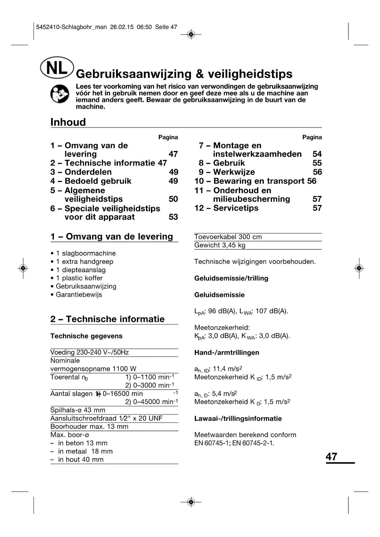 Meetwaarden berekend conform EN 60745-1; EN 60745-2-1.