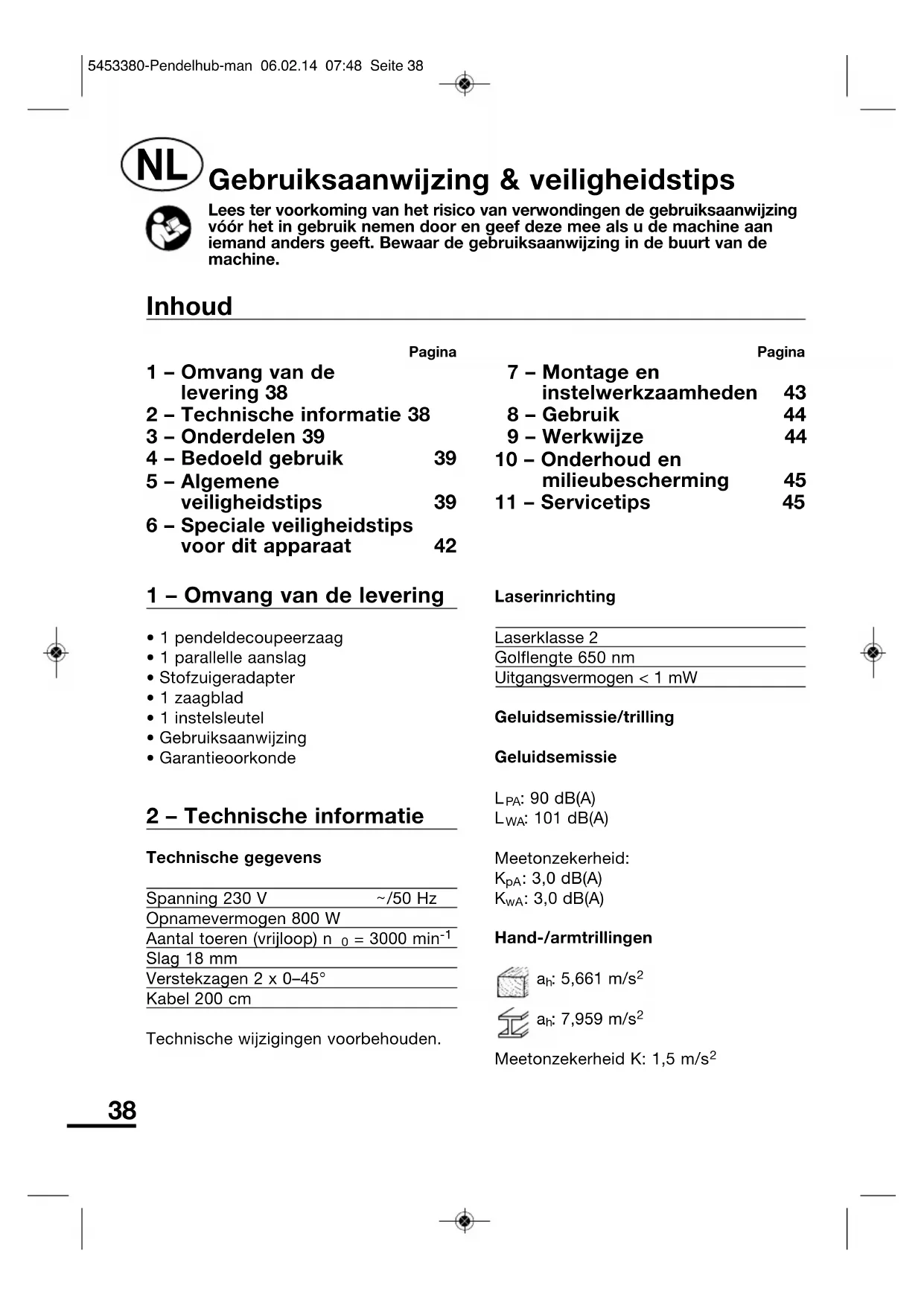 - 1 pendeldecoupeerzaag• 1 parallelle aanslag• Stofzuigeradapter• 1 zaagblad• 1 instelsleutel• Gebruiksaanwijzing• Garantieoorkonde 2 – Technische informatie Technische gegevensSpanning 230 V /50 HzOpnamevermogen 800 WAantal toeren (vrijloop) n = 3000 min Slag 18 mmVerstekzagen 2 x 0–45°Kabel 200 cmTechnische wijzigingen voorbehouden.LaserinrichtingLaserklasse 2Golflengte 650 nmUitgangsvermogen < 1 mWGeluidsemissie/trillingGeluidsemissie