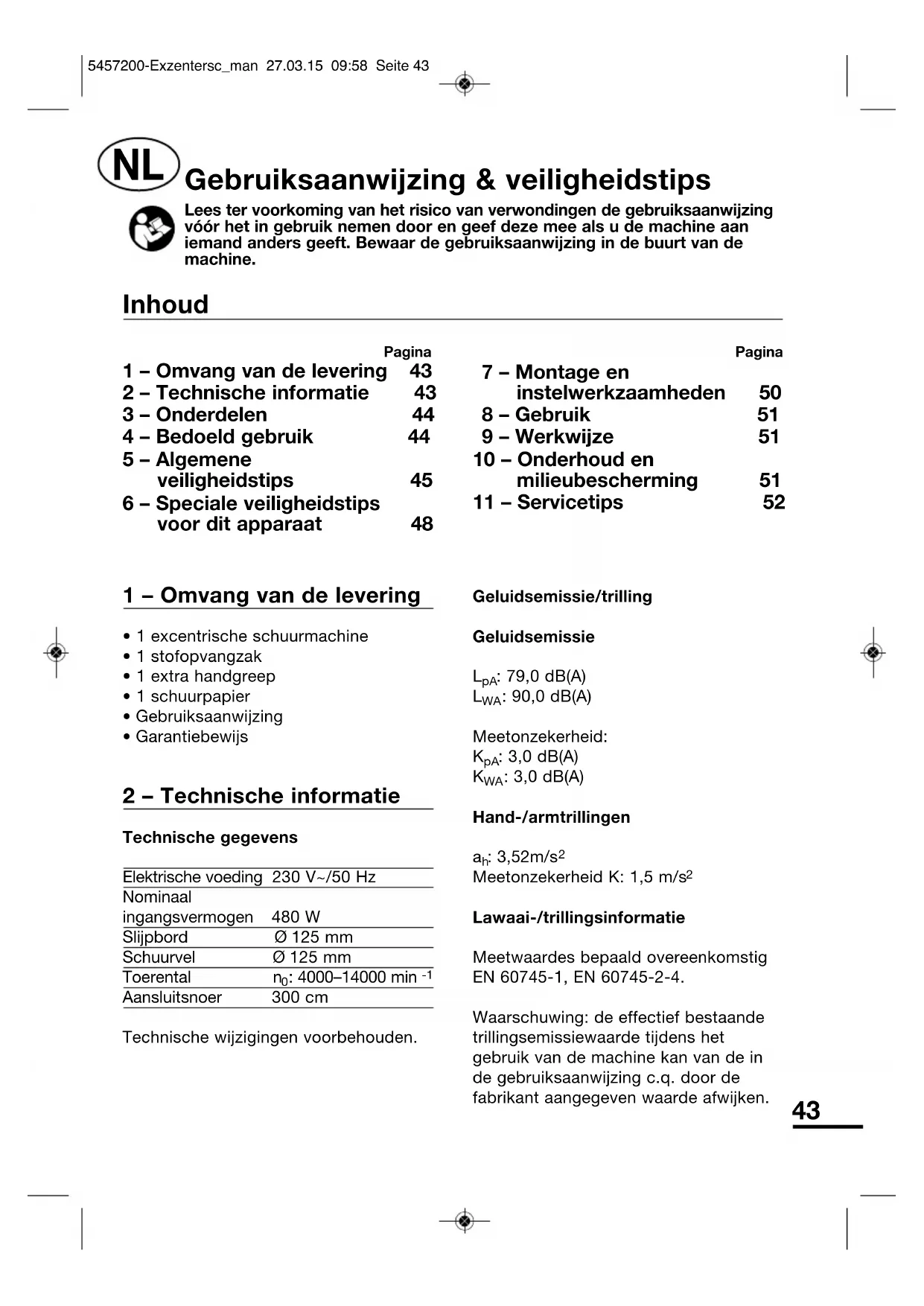 Pagina 1 – Omvang van de levering 43 2 – Technische informatie 43 3 – Onderdelen 44 4 – Bedoeld gebruik 44 5 – Algemene veiligheidstips 45 6 – Speciale veiligheidstips voor dit apparaat 48 Pagina 7 – Montage en instelwerkzaamheden 50 8 – Gebruik 51 9 – Werkwijze 51 10 – Onderhoud en milieubescherming 51 11 – Servicetips 52 Inhoud 5457200-Exzentersc_man 27.03.15 09:58 Seite 4344 Dit kan veroorzaakt worden door volgende invloedsfactoren, die telkens vóór c.q. tijdens het gebruik in acht genomen dienen te worden: