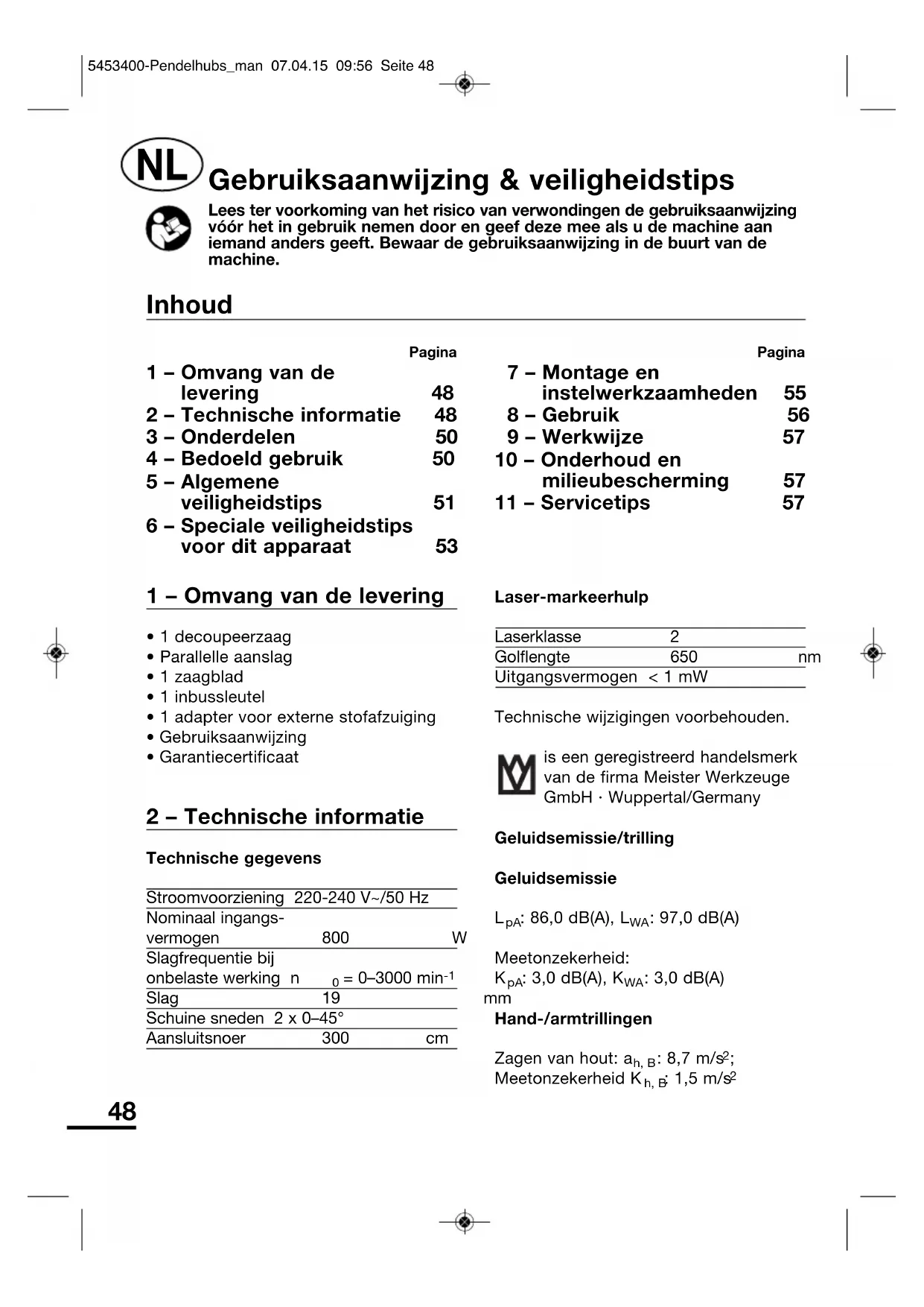 - 1 decoupeerzaag• Parallelle aanslag• 1 zaagblad• 1 inbussleutel• 1 adapter voor externe stofafzuiging• Gebruiksaanwijzing• Garantiecertificaat 2 – Technische informatie Technische gegevensStroomvoorziening 220-240 V~/50 HzNominaal ingangs-vermogen 800 WSlagfrequentie bijonbelaste werking n = 0–3000 min Slag 19 mmSchuine sneden 2 x 0–45°Aansluitsnoer 300 cmLaser-markeerhulpLaserklasse 2Golflengte 650 nmUitgangsvermogen < 1 mWTechnische wijzigingen voorbehouden.is een geregistreerd handelsmerkvan de firma Meister WerkzeugeGmbH · Wuppertal/GermanyGeluidsemissie/trilling Geluidsemissie