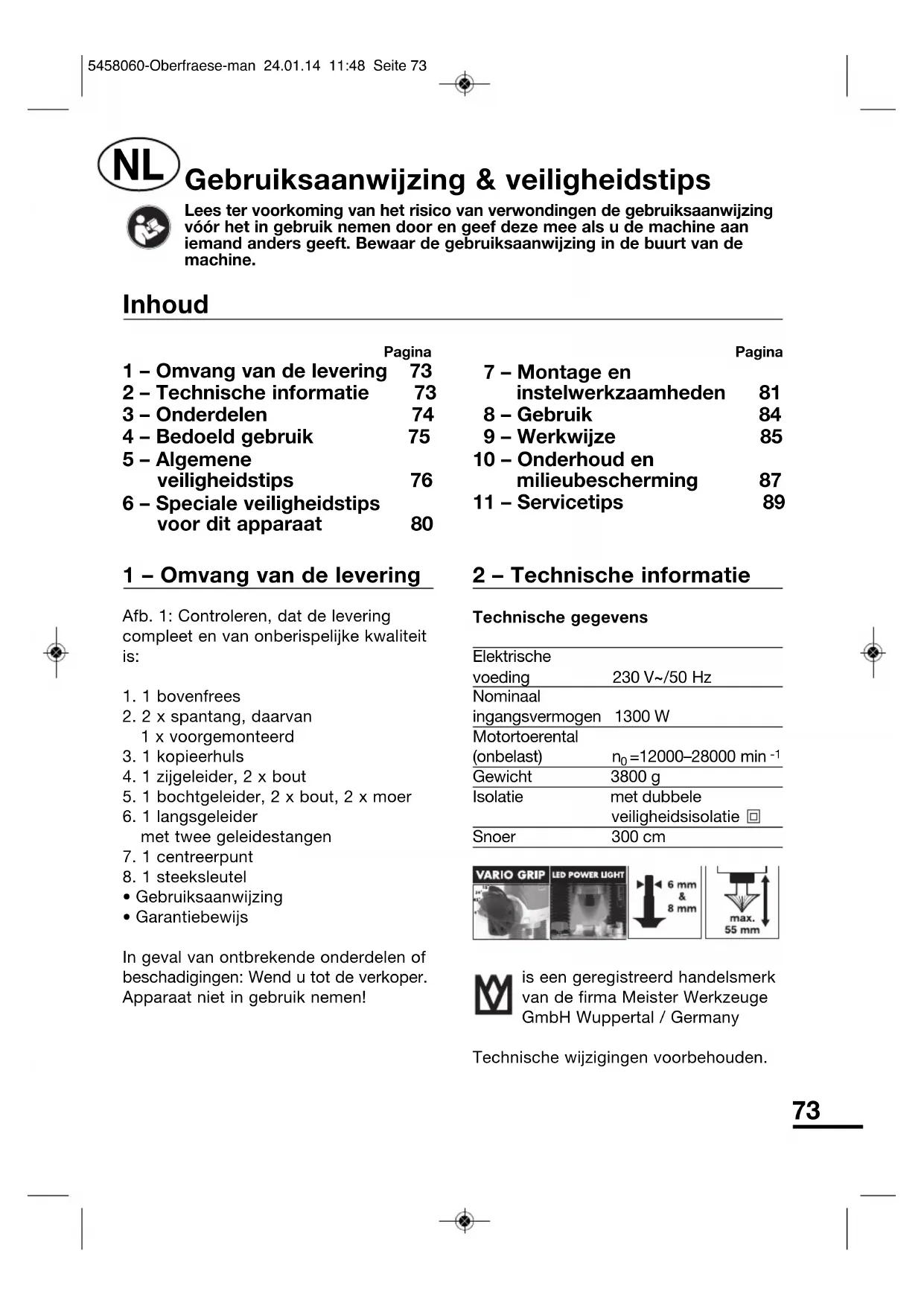 BELANGRIJK! Wij wijzen er uitdrukkelijk op, dat wij volgens de wet op de productaansprakelijk heid nicht voor door once apparaten veroorzaakte schade op hoeven te komen, voor zover deze door oneskundige reparatie veroorzaakt of bij een verrangen van onderdelen Niet once originele onderdelen of door ons goedgekeurde onderdelen gebruikt werden en de reparatie Niet door de klantenservice van Meister Werk zeuge GmbH of een geauthoriseerdevakmanuitgevoerd werk! Dit geldt ook voor de gebruekte accessoires.