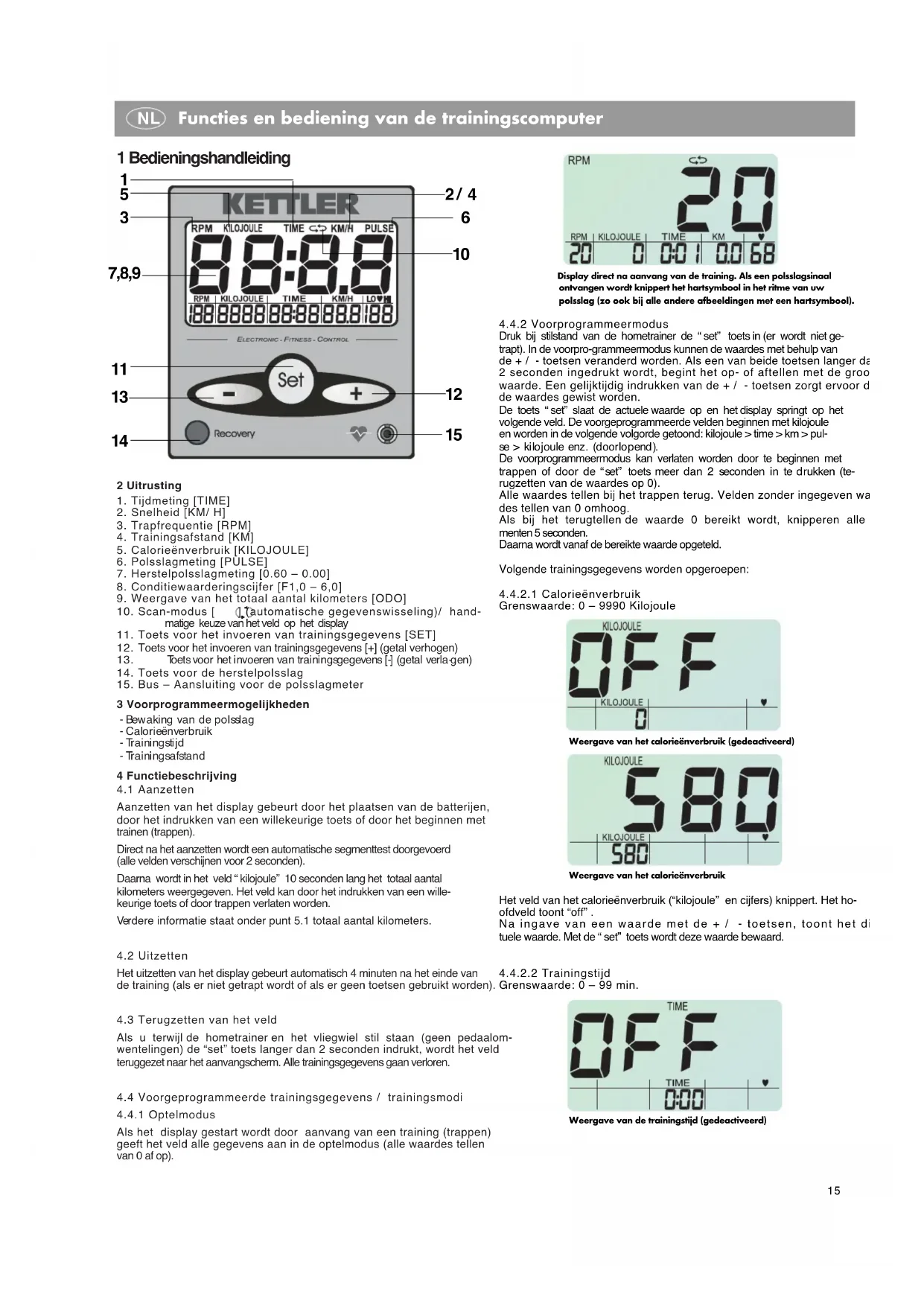 Druk bij stilstand van de hometrainer de “ set” toets in (er wordt niet ge- trapt). In de voorpro-grammeermodus kunnen de waardes met behulp van de + / - toetsen veranderd worden. Als een van beide toetsen langer dan 2 seconden ingedrukt wordt, begint het op- of aftellen met de grootste waarde. Een gelijktijdig indrukken van de + / - toetsen zorgt ervoor dat de waardes gewist worden. De toets “ set” slaat de actuele waarde op en het display springt op het volgende veld. De voorgeprogrammeerde velden beginnen met kilojoule en worden in de volgende volgorde getoond: kilojoule > time > km > pul- se > ki loj oule enz . (doorlopend ). De voorprogrammeermodus kan verlaten worden door te beginnen met trappen of door de “ set” toets meer dan 2 seconden in te drukken (te- rugzetten van de waardes op 0). Alle waardes tellen bij het trappen terug. Velden zonder ingegeven waar- des tellen van 0 omhoog. Als bij het terugtellen de waarde 0 bereikt wordt, knipperen alle seg- menten 5 seconden. Daarna wordt vanaf de bereikte waarde opgeteld. Volgende trainingsgegevens worden opgeroepen: