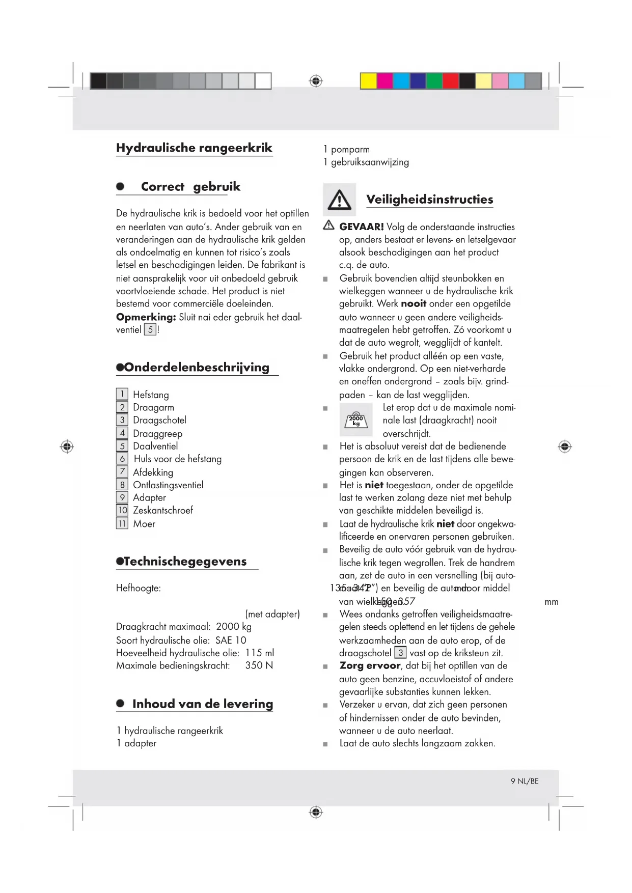 Moer Technische gegevens Hefhoogte: 135–342 mm 150–357 mm (met adapter) Draagkracht maximaal: 2000 kg Soort hydraulische olie: SAE 10 Hoeveelheid hydraulische olie: 115 ml Maximale bedieningskracht: 350 N Inhoud van de levering 1 hydraulische rangeerkrik 1 adapter 1 pomparm 1 gebruiksaanwijzing Veiligheidsinstructies GEVAAR! Volg de onderstaande instructies op, anders bestaat er levens- en letselgevaar alsook beschadigingen aan het product c.q. de auto. Gebruik bovendien altijd steunbokken en wielkeggen wanneer u de hydraulische krik gebruikt. Werk nooit onder een opgetilde auto wanneer u geen andere veiligheids- maatregelen hebt getroffen. Zó voorkomt u dat de auto wegrolt, wegglijdt of kantelt. Gebruik het product alléén op een vaste, vlakke ondergrond. Op een niet-verharde en oneffen ondergrond – zoals bijv. grind- paden – kan de last wegglijden.