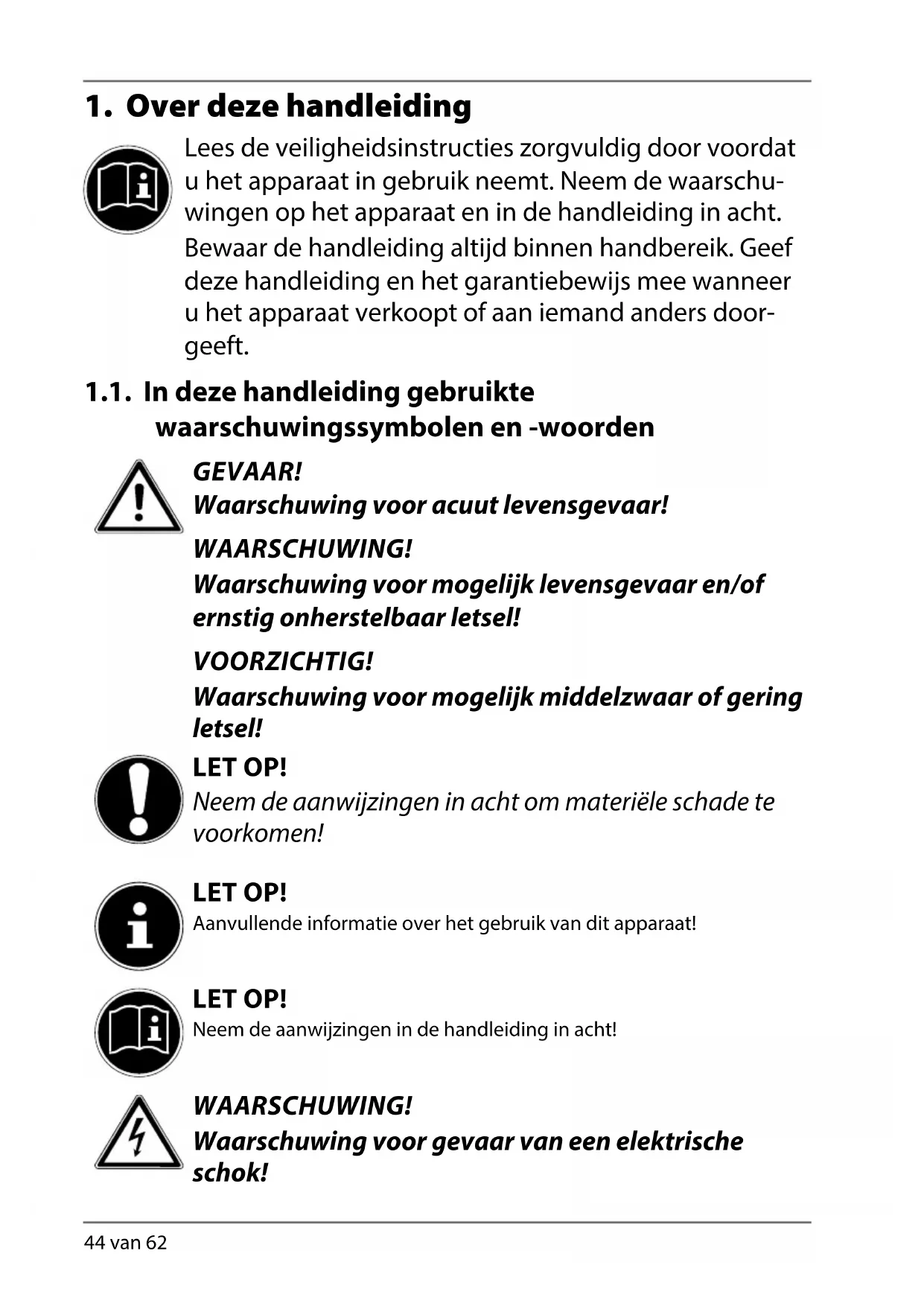 Lees de veiligheidsinstructies zorgvuldig door voordat u het apparaat in gebruik neemt. Neem de waarschu- wingen op het apparaat en in de handleiding in acht. Bewaar de handleiding altijd binnen handbereik. Geef deze handleiding en het garantiebewijs mee wanneer u het apparaat verkoopt of aan iemand anders door- geeft. 1.1. In deze handleiding gebruikte waarschuwingssymbolen en -woorden GEVAAR! Waarschuwing voor acuut levensgevaar! WAARSCHUWING! Waarschuwing voor mogelijk levensgevaar en/of ernstig onherstelbaar letsel! VOORZICHTIG! Waarschuwing voor mogelijk middelzwaar of gering letsel! LET OP! Neem de aanwijzingen in acht om materiële schade te voorkomen! LET OP! Aanvullende informatie over het gebruik van dit apparaat! LET OP! Neem de aanwijzingen in de handleiding in acht! WAARSCHUWING! Waarschuwing voor gevaar van een elektrische schok! 15324 DE-FR-NL eCommerce Content Final.indb 4415324 DE-FR-NL eCommerce Content Final.indb 44 01.02.2016 09:20:2801.02.2016 09:20:28DE