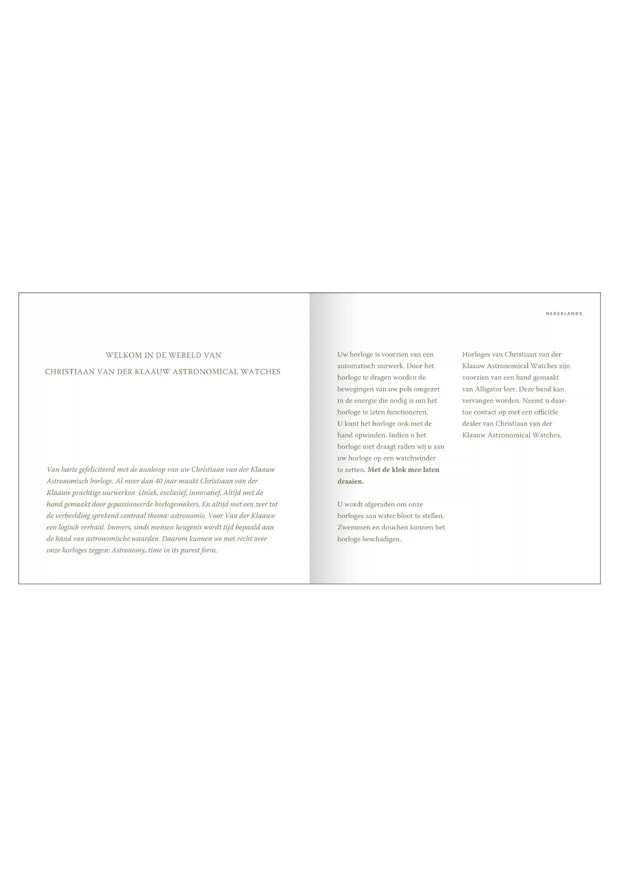 Van harte gefeliciteerd met de aankoop van uw Christiaan van der Klaauw Astronomisch horloge. Al meer dan 40 jaar maakt Christiaan van der Klaauw prachtige uurwerken Uniek, exclusief, innovatief. Altijd met de hand gemaakt door gepassioneerde horlogemakers. En altijd met een zeer tot de verbeelding sprekend centraal thema: astronomie. Voor Van der Klaauw een logisch verhaal. Immers, sinds mensen heugenis wordt tijd bepaald aan de hand van astronomische waarden. Daarom kunnen we met recht over onze horloges zeggen: Astronomy, time in its purest form. Uw horloge is voorzien van een automatisch uurwerk. Door het horloge te dragen worden de bewegingen van uw pols omgezet in de energie die nodig is om het horloge te laten functioneren. U kunt het horloge ook met de hand opwinden. Indien u het horloge niet draagt raden wij u aan uw horloge op een watchwinder te zetten. Met de klok mee laten draaien. U wordt afgeraden om onze horloges aan water bloot te stellen. Zwemmen en douchen kunnen het horloge beschadigen. Horloges van Christiaan van der Klaauw Astronomical Watches zijn voorzien van een band gemaakt van Alligator leer. Deze band kan vervangen worden. Neemt u daar- toe contact op met een ociële dealer van Christiaan van der Klaauw Astronomical Watches. NEDERLANDSSpecicaties Op de Real Moon Tides zijn de volgende gegevens af te lezen: