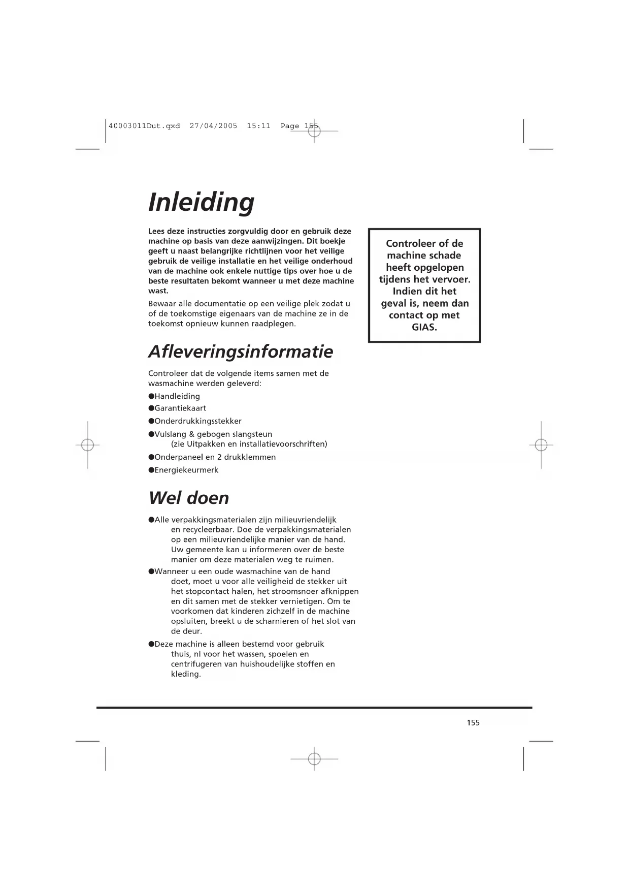Controleer of de machine schade heeft opgelopen tijdens het vervoer. Indien dit het geval is, neem dan contact op met GIAS. 40003011Dut.qxd 27/04/2005 15:11 Page 155Niet doen ● Raak de machine niet aan als uw handen of voeten nat of vochtig zijn. ● Leun niet tegen de deur als u de machine laadt en gebruik de deur niet om de machine op te tillen of te verplaatsen. ● Gebruik geen adapters, meervoudige stekkers en/of verlengsnoeren. ● Sta niet toe dat kinderen met de machine of de bediening ervan spelen. ● Open de deur niet als er water zichtbaar is in de trommel of als de -indicator aan is.