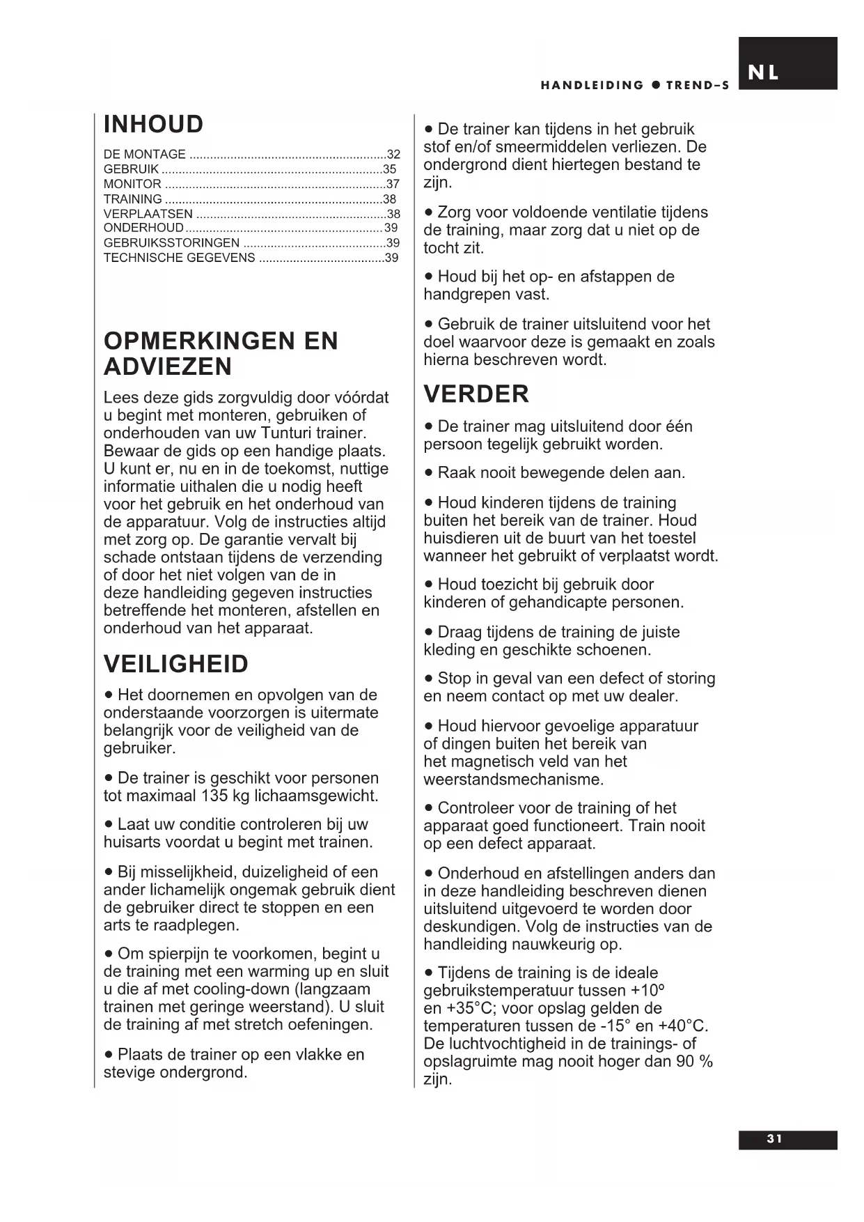 HANDLEIDING TREND–S OPMERKINGEN EN ADVIEZEN Lees deze gids zorgvuldig door vóórdat u begint met monteren, gebruiken of onderhouden van uw Tunturi trainer. Bewaar de gids op een handige plaats. U kunt er, nu en in de toekomst, nuttige informatie uithalen die u nodig heeft voor het gebruik en het onderhoud van de apparatuur. Volg de instructies altijd met zorg op. De garantie vervalt bij schade ontstaan tijdens de verzending of door het niet volgen van de in deze handleiding gegeven instructies betreffende het monteren, afstellen en onderhoud van het apparaat. VEILIGHEID