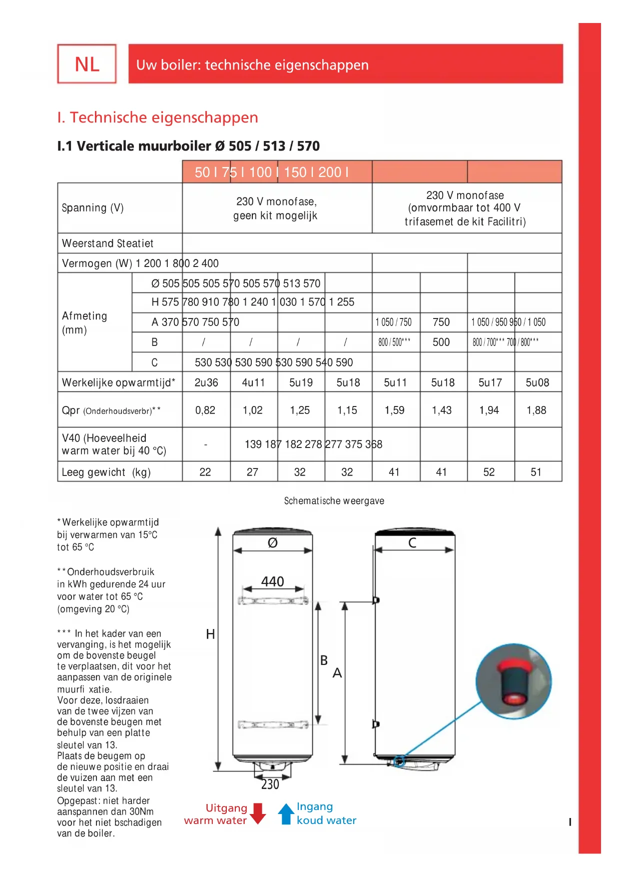 I.1 Verticale muurboiler Ø 505 / 513 / 570 *Werkelijke opwarmtijd bij verwarmen van 15°C tot 65 °C**Onderhoudsverbruik in kWh gedurende 24 uur voor water tot 65 °C (omgeving 20 °C)*** In het kader van een vervanging, is het mogelijk om de bovenste beugel te verplaatsen, dit voor het aanpassen van de originele muurfi xatie.Voor deze, losdraaien van de twee vijzen van de bovenste beugen met behulp van een platte sleutel van 13.Plaats de beugem op de nieuwe positie en draai de vuizen aan met een sleutel van 13.Opgepast: niet harder aanspannen dan 30Nm voor het niet bschadigen van de boiler.Schematische weergave Uw boiler: technische eigenschappen Uitgang warm water Ingang koud water