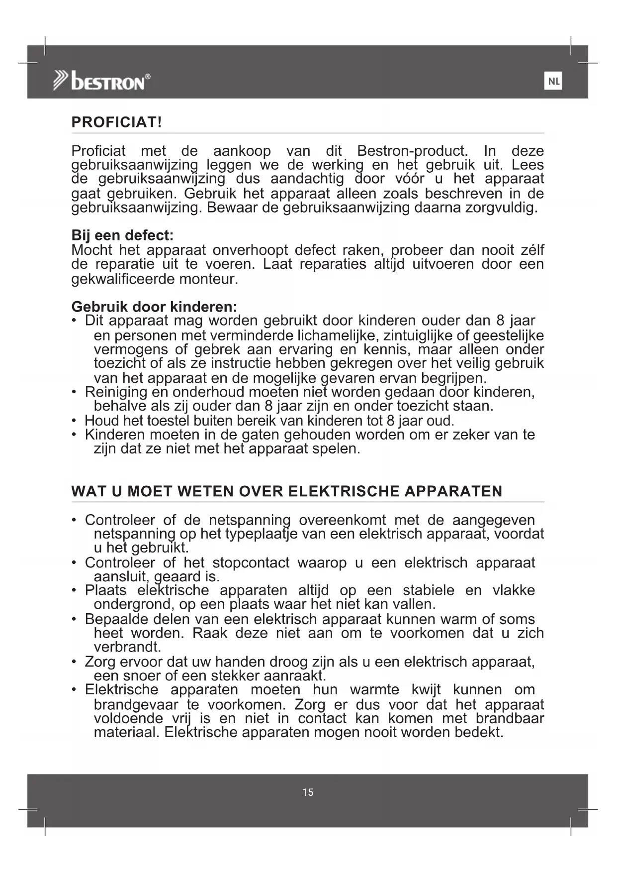 PROFICIAT! Proficiat met de aankoop van dit Bestron-product. In deze gebruiksaanwijzing leggen we de werking en het gebruik uit. Lees de gebruiksaanwijzing dus aandachtig door vóór u het apparaat gaat gebruiken. Gebruik het apparaat alleen zoals beschreven in de gebruiksaanwijzing. Bewaar de gebruiksaanwijzing daarna zorgvuldig. Bij een defect: Mocht het apparaat onverhoopt defect raken, probeer dan nooit zélf de reparatie uit te voeren. Laat reparaties altijd uitvoeren door een gekwalificeerde monteur. Gebruik door kinderen: