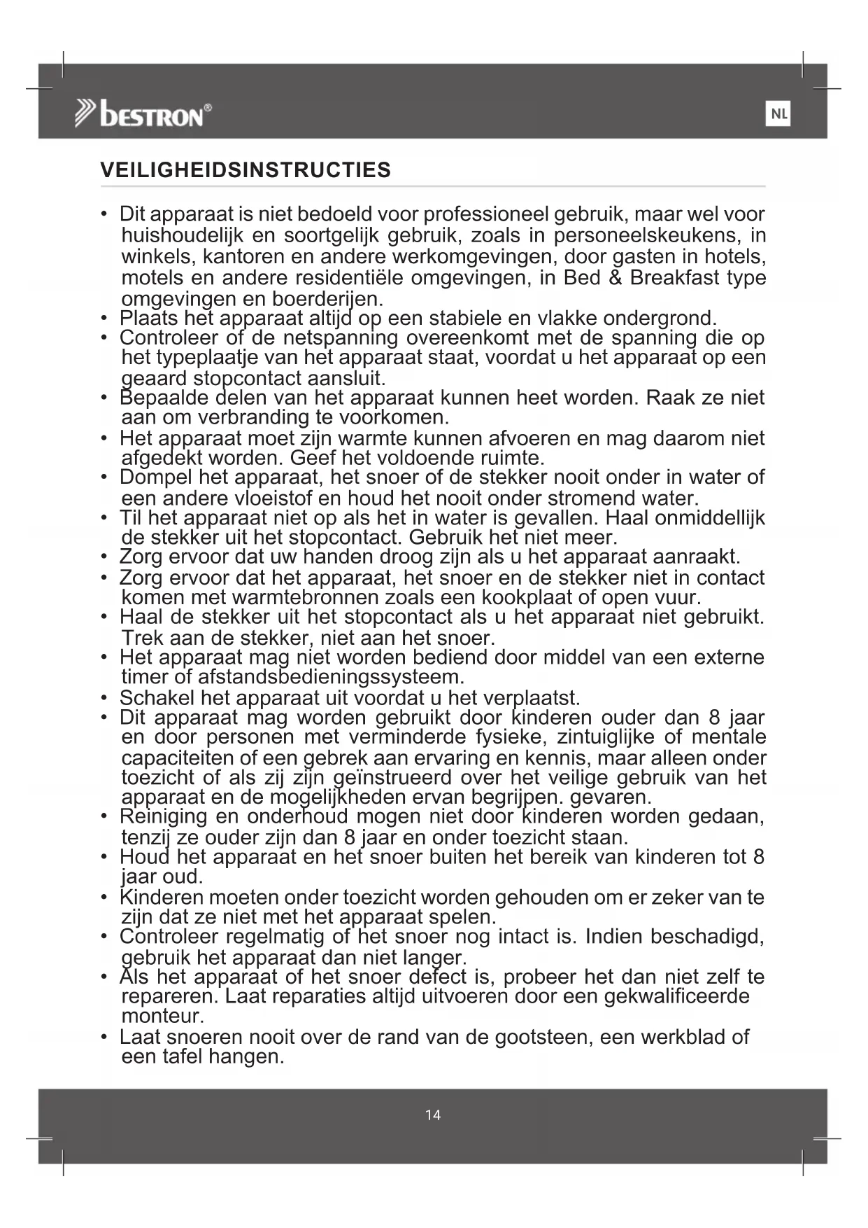 - Informeer bij de gemeente naar het juiste inzamelpunt bij u in de buurt. SERVICE Mocht er onverhoopt toch een storing optreden, dan kunt u contact opnemen met de service van Bestron: www.bestron.com/service