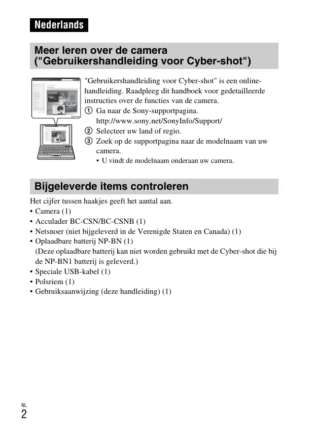 Nederlands Meer leren over de camera ("Gebruikershandleiding voor Cyber-shot") "Gebruikershandleiding voor Cyber-shot" is een onlinehandleiding. Raadpleeg dit handboek voor gedetailleerde instructies over de functies van de camera. 1 Ga naar de Sony-supportpagina. http://www.sony.net/SonyInfo/Support/ 2 Selecteer uw land of regio. 3 Zoek op de supportpagina naar de modelnaam van uw camera.
