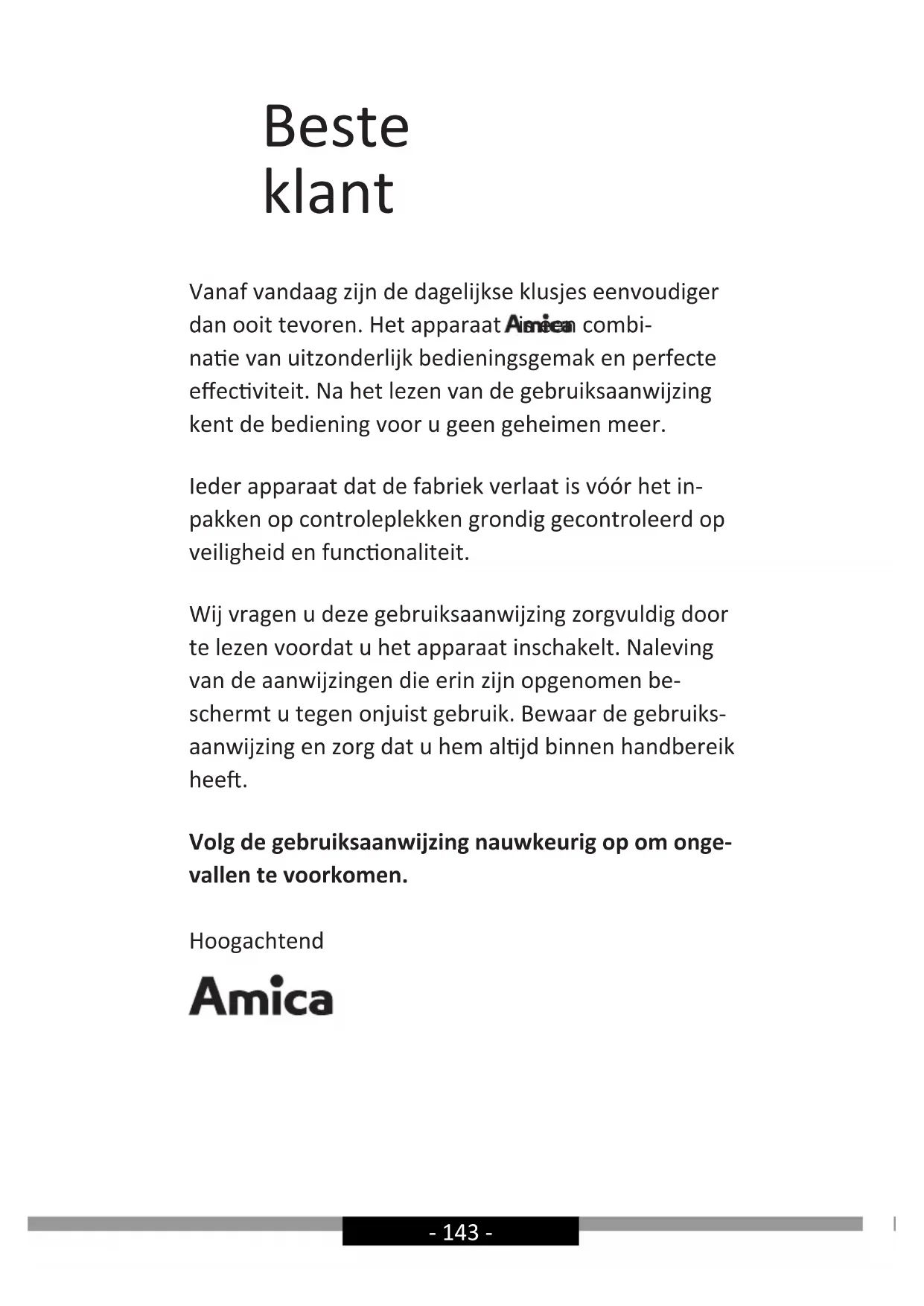 - directive RoHS 2011/65/CE et c’est le pourquoi le produit est désigné par le symbol ainsi qu’une déclaration de la conformité accessible aux organes chargés de la surveillance du marché a été délivrée.- 143 - Beste klant Vanaf vandaag zijn de dagelijkse klusjes eenvoudiger dan ooit tevoren. Het apparaat is een combi- nae van uitzonderlijk bedieningsgemak en perfecte eecviteit. Na het lezen van de gebruiksaanwijzing kent de bediening voor u geen geheimen meer. Ieder apparaat dat de fabriek verlaat is vóór het in- pakken op controleplekken grondig gecontroleerd op veiligheid en funconaliteit. Wij vragen u deze gebruiksaanwijzing zorgvuldig door te lezen voordat u het apparaat inschakelt. Naleving van de aanwijzingen die erin zijn opgenomen be- schermt u tegen onjuist gebruik. Bewaar de gebruiks- aanwijzing en zorg dat u hem aljd binnen handbereik hee. Volg de gebruiksaanwijzing nauwkeurig op om onge- vallen te voorkomen. Hoogachtend- 144 - AANWIJZINGEN BETREF-