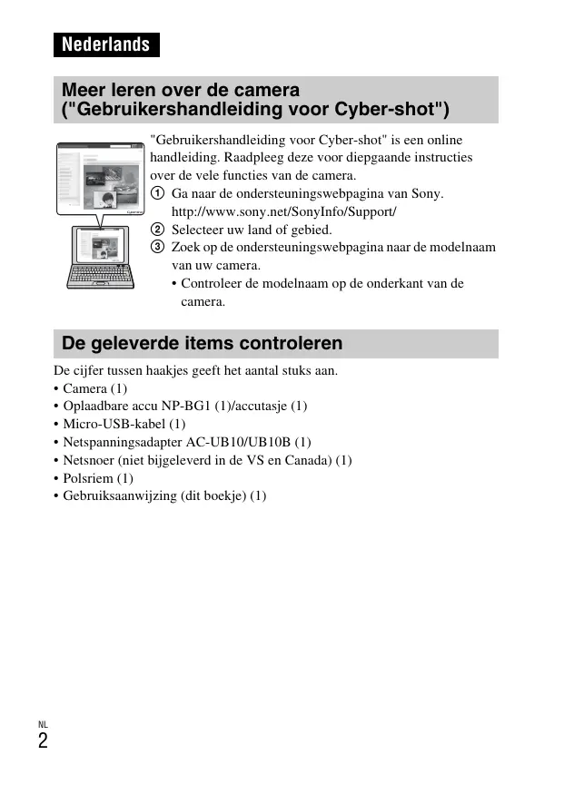 Nederlands Meer leren over de camera ("Gebruikershandleiding voor Cyber-shot") "Gebruikershandleiding voor Cyber-shot" is een online handleiding. Raadpleeg deze voor diepgaande instructies over de vele functies van de camera. 1 Ga naar de ondersteuningswebpagina van Sony. http://www.sony.net/SonyInfo/Support/ 2 Selecteer uw land of gebied. 3 Zoek op de ondersteuningswebpagina naar de modelnaam van uw camera.