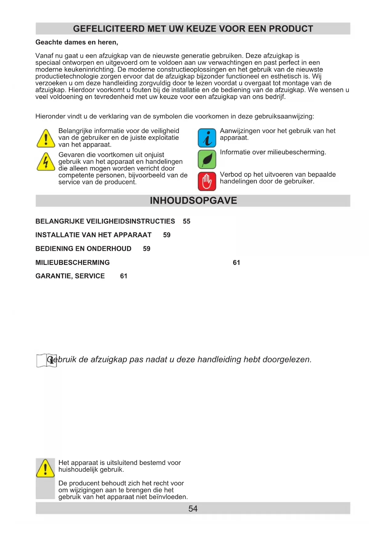 MILIEUBESCHERMING 61 GARANTIE, SERVICE 61 Het apparaat is uitsluitend bestemd voor huishoudelijk gebruik. De producent behoudt zich het recht voor om wijzigingen aan te brengen die het gebruik van het apparaat niet beïnvloeden. Gebruikdeafzuigkappasnadatudezehandleidinghebtdoorgelezen.55 BELANGRIJKE VEILIGHEIDSINSTRUCTIES