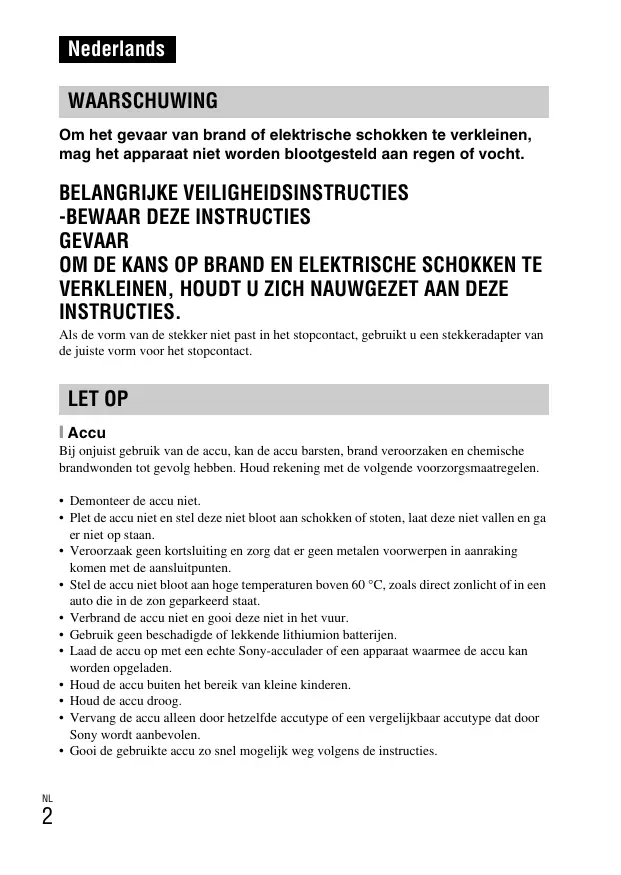 GEVAAR OM DE KANS OP BRAND EN ELEKTRISCHE SCHOKKEN TE VERKLEINEN, HOUDT U ZICH NAUWGEZET AAN DEZE INSTRUCTIES. Als de vorm van de stekker niet past in het stopcontact, gebruikt u een stekkeradapter van de juiste vorm voor het stopcontact. LET OP [ Accu Bij onjuist gebruik van de accu, kan de accu barsten, brand veroorzaken en chemische brandwonden tot gevolg hebben. Houd rekening met de volgende voorzorgsmaatregelen.