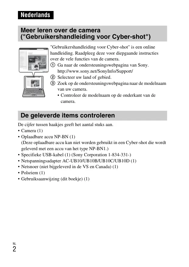 Nederlands Meer leren over de camera ("Gebruikershandleiding voor Cyber-shot") "Gebruikershandleiding voor Cyber-shot" is een online handleiding. Raadpleeg deze voor diepgaande instructies over de vele functies van de camera. 1 Ga naar de ondersteuningswebpagina van Sony. http://www.sony.net/SonyInfo/Support/ 2 Selecteer uw land of gebied. 3 Zoek op de ondersteuningswebpagina naar de modelnaam van uw camera.