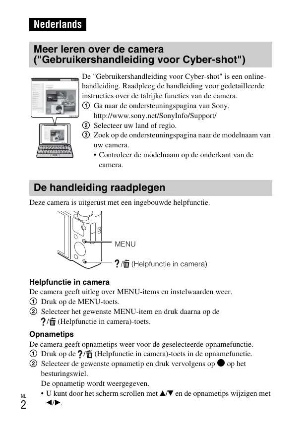 Nederlands Meer leren over de camera ("Gebruikershandleiding voor Cyber-shot") De "Gebruikershandleiding voor Cyber-shot" is een onlinehandleiding. Raadpleeg de handleiding voor gedetailleerde instructies over de talrijke functies van de camera. 1 Ga naar de ondersteuningspagina van Sony. http://www.sony.net/SonyInfo/Support/ 2 Selecteer uw land of regio. 3 Zoek op de ondersteuningspagina naar de modelnaam van uw camera.