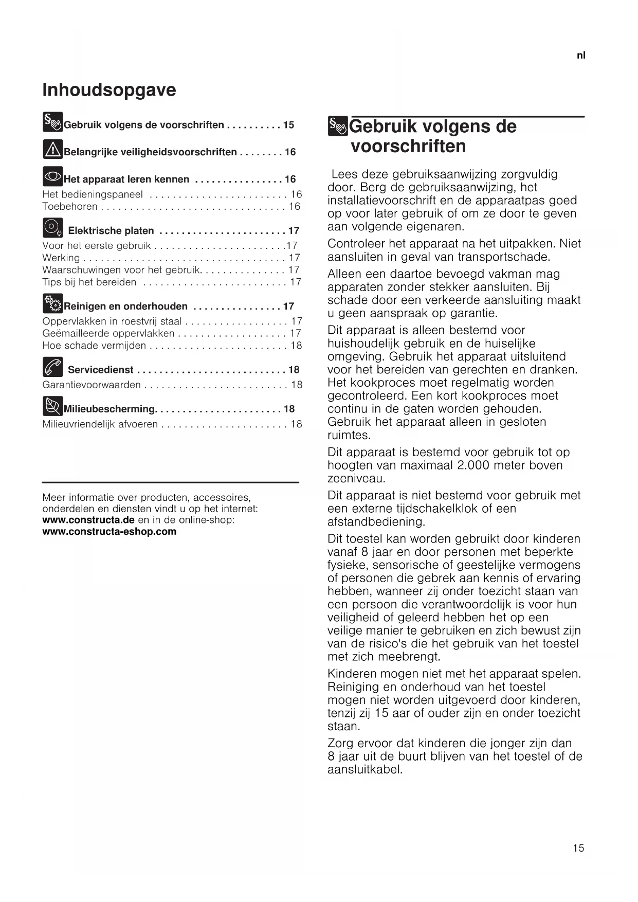 - Het apparaat leren kennen . . . . . . . . . . . . . . . . 16 Het bedieningspaneel . . . . . . . . . . . . . . . . . . . . . . . . 16 Toebehoren . . . . . . . . . . . . . . . . . . . . . . . . . . . . . . . . 16 ~ Elektrische platen . . . . . . . . . . . . . . . . . . . . . . . 17 Voor het eerste gebruik . . . . . . . . . . . . . . . . . . . . . . .17 Werking . . . . . . . . . . . . . . . . . . . . . . . . . . . . . . . . . . . 17 Waarschuwingen voor het gebruik. . . . . . . . . . . . . . . 17 Tips bij het bereiden . . . . . . . . . . . . . . . . . . . . . . . . . 17 2 Reinigen en onderhouden . . . . . . . . . . . . . . . . 17 Oppervlakken in roestvrij staal . . . . . . . . . . . . . . . . . . 17 Geëmailleerde oppervlakken . . . . . . . . . . . . . . . . . . . 17 Hoe schade vermijden . . . . . . . . . . . . . . . . . . . . . . . . 18 4 Servicedienst . . . . . . . . . . . . . . . . . . . . . . . . . . . 18 Garantievoorwaarden . . . . . . . . . . . . . . . . . . . . . . . . . 18 7 Milieubescherming. . . . . . . . . . . . . . . . . . . . . . . 18 Milieuvriendelijk afvoeren . . . . . . . . . . . . . . . . . . . . . . 18 Produktinfo Meer informatie over producten, accessoires, onderdelen en diensten vindt u op het internet: www.constructa.de en in de online-shop: www.constructa-eshop.com 8Gebruik volgens de voorschriften Gebr ui k vol gens de voor schr i f t en Lees deze gebruiksaanwijzing zorgvuldig door. Berg de gebruiksaanwijzing, het installatievoorschrift en de apparaatpas goed op voor later gebruik of om ze door te geven aan volgende eigenaren. Controleer het apparaat na het uitpakken. Niet aansluiten in geval van transportschade. Alleen een daartoe bevoegd vakman mag apparaten zonder stekker aansluiten. Bij schade door een verkeerde aansluiting maakt u geen aanspraak op garantie. Dit apparaat is alleen bestemd voor huishoudelijk gebruik en de huiselijke omgeving. Gebruik het apparaat uitsluitend voor het bereiden van gerechten en dranken. Het kookproces moet regelmatig worden gecontroleerd. Een kort kookproces moet continu in de gaten worden gehouden. Gebruik het apparaat alleen in gesloten ruimtes. Dit apparaat is bestemd voor gebruik tot op hoogten van maximaal 2.000 meter boven zeeniveau. Dit apparaat is niet bestemd voor gebruik met een externe tijdschakelklok of een afstandbediening. Dit toestel kan worden gebruikt door kinderen vanaf 8 jaar en door personen met beperkte fysieke, sensorische of geestelijke vermogens of personen die gebrek aan kennis of ervaring hebben, wanneer zij onder toezicht staan van een persoon die verantwoordelijk is voor hun veiligheid of geleerd hebben het op een veilige manier te gebruiken en zich bewust zijn van de risico's die het gebruik van het toestel met zich meebrengt. Kinderen mogen niet met het apparaat spelen. Reiniging en onderhoud van het toestel mogen niet worden uitgevoerd door kinderen, tenzij zij 15 aar of ouder zijn en onder toezicht staan. Zorg ervoor dat kinderen die jonger zijn dan 8 jaar uit de buurt blijven van het toestel of de aansluitkabel.nl Belangrijke veiligheidsvoorschriften