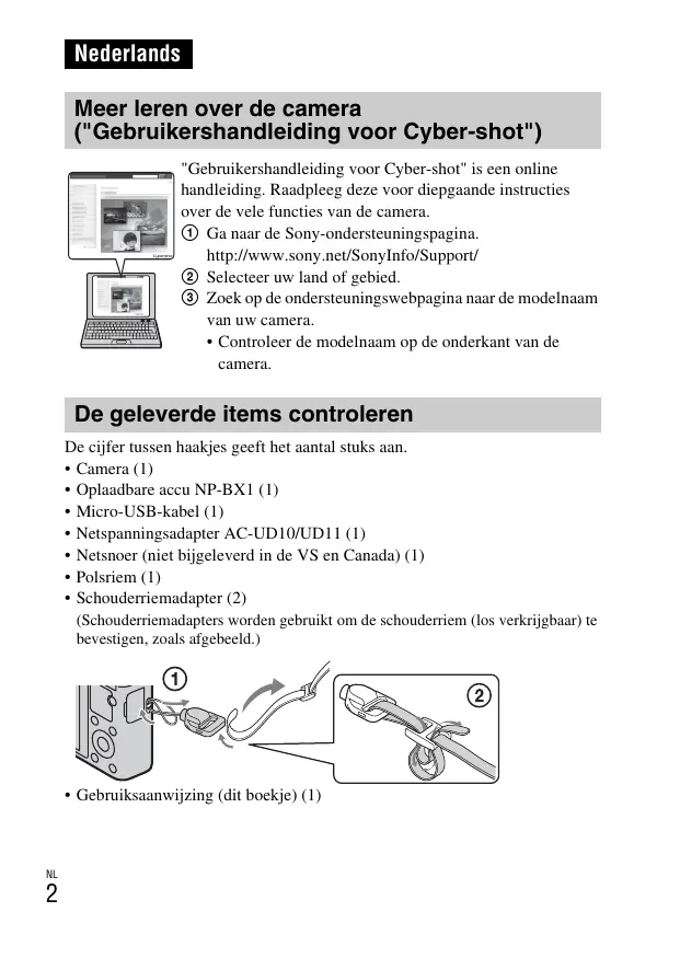 Nederlands Meer leren over de camera ("Gebruikershandleiding voor Cyber-shot") "Gebruikershandleiding voor Cyber-shot" is een online handleiding. Raadpleeg deze voor diepgaande instructies over de vele functies van de camera. 1 Ga naar de Sony-ondersteuningspagina. http://www.sony.net/SonyInfo/Support/ 2 Selecteer uw land of gebied. 3 Zoek op de ondersteuningswebpagina naar de modelnaam van uw camera.