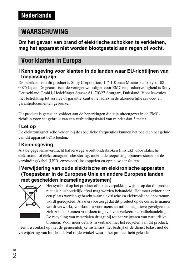 Nederlands WAARSCHUWING Om het gevaar van brand of elektrische schokken te verkleinen, mag het apparaat niet worden blootgesteld aan regen of vocht. Voor klanten in Europa [ Kennisgeving voor klanten in de landen waar EU-richtlijnen van toepassing zijn De fabrikant van dit product is Sony Corporation, 1-7-1 Konan Minato-ku Tokyo, 1080075 Japan. De geautoriseerde vertegenwoordiger voor EMC en productveiligheid is Sony Deutschland GmbH, Hedelfinger Strasse 61, 70327 Stuttgart, Duitsland. Voor kwesties met betrekking tot service of garantie kunt u het adres in de afzonderlijke service- en garantiedocumenten gebruiken. Dit product is getest en voldoet aan de beperkingen die zijn uiteengezet in de EMCrichtlijn voor het gebruik van een verbindingskabel van minder dan 3 meter. [ Let op De elektromagnetische velden bij de specifieke frequenties kunnen het beeld en het geluid van dit apparaat beïnvloeden. [ Kennisgeving Als de gegevensoverdracht halverwege wordt onderbroken (mislukt) door statische elektriciteit of elektromagnetische storing, moet u de toepassing opnieuw starten of de verbindingskabel (USB, enzovoort) loskoppelen en opnieuw aansluiten. [ Verwijdering van oude elektrische en elektronische apparaten (Toepasbaar in de Europese Unie en andere Europese landen met gescheiden inzamelingssystemen) Het symbool op het product of op de verpakking wijst erop dat dit product niet als huishoudelijk afval mag worden behandeld. Het moet echter naar een plaats worden gebracht waar elektrische en elektronische apparatuur wordt gerecycled. Als u ervoor zorgt dat dit product op de correcte manier wordt verwerkt, voorkomt u voor mens en milieu negatieve gevolgen die zich zouden kunnen voordoen in geval van verkeerde afvalbehandeling. De recycling van materialen draagt bij tot het vrijwaren van natuurlijke bronnen. Voor meer details in verband met het recyclen van dit product, neemt u contact op met de gemeentelijke instanties, het bedrijf of de dienst belast met de verwijdering van huishoudafval of de winkel waar u het product hebt gekocht.