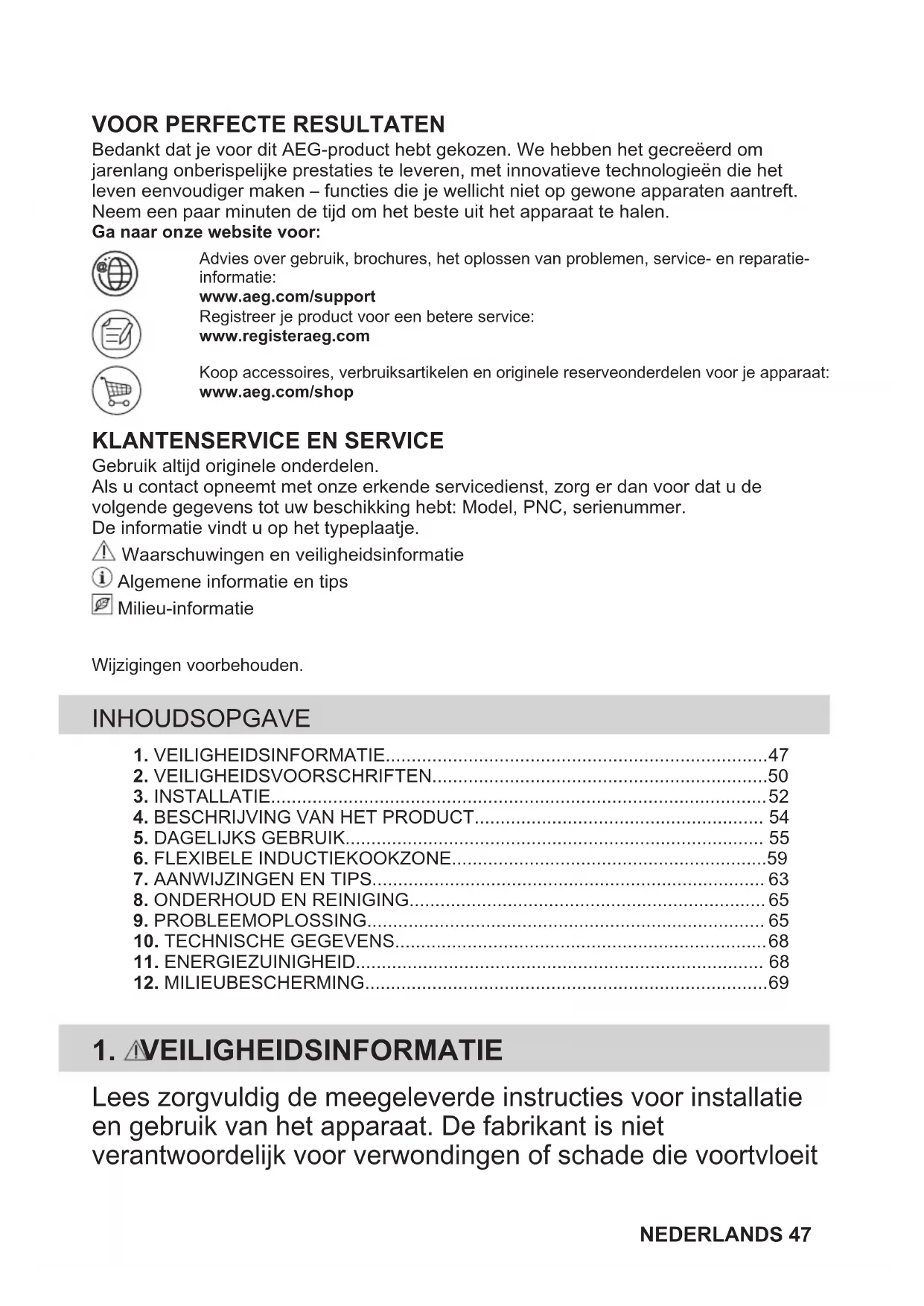 Bedankt dat je voor dit AEG-product hebt gekozen. We hebben het gecreëerd omjarenlang onberispelijke prestaties te leveren, met innovatieve technologieën die hetleven eenvoudiger maken – functies die je wellicht niet op gewone apparaten aantreft.Neem een paar minuten de tijd om het beste uit het apparaat te halen.Ga naar onze website voor:Advies over gebruik, brochures, het oplossen van problemen, service- en reparatie-informatie:www.aeg.com/supportRegistreer je product voor een betere service:www.registeraeg.comKoop accessoires, verbruiksartikelen en originele reserveonderdelen voor je apparaat:www.aeg.com/shop