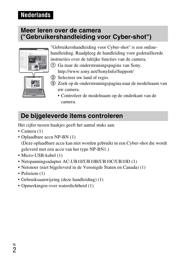 Nederlands Meer leren over de camera ("Gebruikershandleiding voor Cyber-shot") "Gebruikershandleiding voor Cyber-shot" is een onlinehandleiding. Raadpleeg de handleiding voor gedetailleerde instructies over de talrijke functies van de camera. 1 Ga naar de ondersteuningspagina van Sony. http://www.sony.net/SonyInfo/Support/ 2 Selecteer uw land of regio. 3 Zoek op de ondersteuningspagina naar de modelnaam van uw camera.
