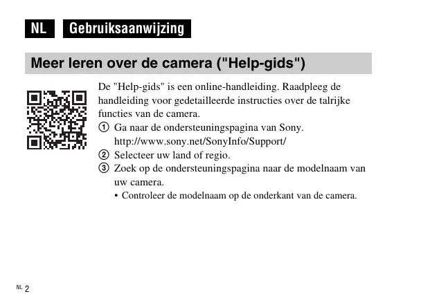 Gebruiksaanwijzing Meer leren over de camera ("Help-gids") De "Help-gids" is een online-handleiding. Raadpleeg de handleiding voor gedetailleerde instructies over de talrijke functies van de camera. 1 Ga naar de ondersteuningspagina van Sony. http://www.sony.net/SonyInfo/Support/ 2 Selecteer uw land of regio. 3 Zoek op de ondersteuningspagina naar de modelnaam van uw camera.