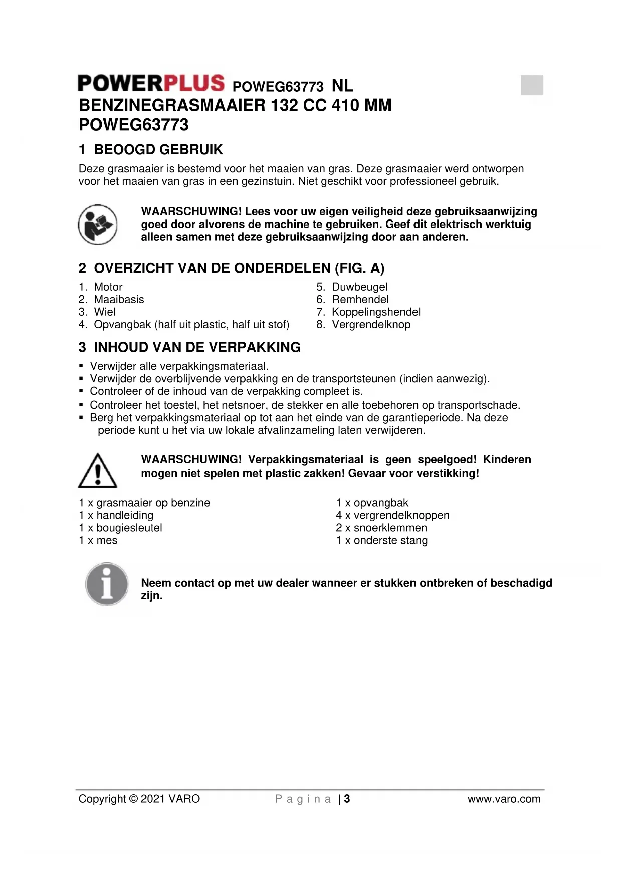 - Berg het verpakkingsmateriaal op tot aan het einde van de garantieperiode. Na deze periode kunt u het via uw lokale afvalinzameling laten verwijderen. WAARSCHUWING! Verpakkingsmateriaal is geen speelgoed! Kinderen mogen niet spelen met plastic zakken! Gevaar voor verstikking! 1 x grasmaaier op benzine 1 x handleiding 1 x bougiesleutel 1 x mes 1 x opvangbak 4 x vergrendelknoppen 2 x snoerklemmen 1 x onderste stang Neem contact op met uw dealer wanneer er stukken ontbreken of beschadigd zijn.POWEG63773 NL Copyright © 2021 VARO P a g i n a | 4 www.varo.com