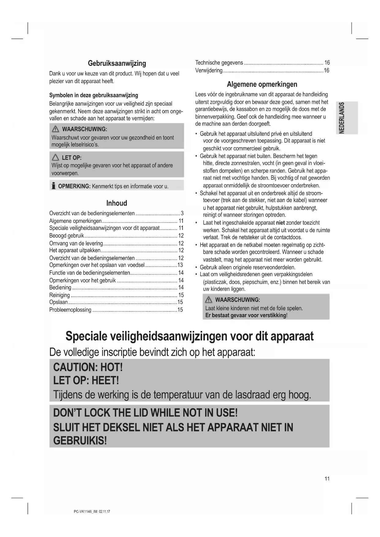 Probleem Mogelijke oorzaak Maatregel De zak wordt niet volledig leeggemaakt. Er was te veel lucht in de zak en kon in de gegeven tijd niet worden wegge- zogen. Knijp vooraf de overmatige lucht eruit. Selecteer de TURBO-functie. U heeft folie zonder textuur gebruikt. Als u vacuumtrekt, gebruik dan folie met ribbel, honingraat of ruitvormige textuur. De zak is beschadigd. Gebruik een nieuwe zak. Het apparaat genereert een vacuüm maar geen warm- seal. De onderste afdichting is vervormd. Strijk de afdichting glad en seal opnieuw. De zak zit te vol. Verwijder wat van de inhoud en maak de hoeken van de zak schoon. De zak is niet luchtdicht. Het apparaat stopt niet automatisch. Druk op de STOP toets om het proces af te breken. Het apparaat genereert een warm- seal maar geen vacuüm. De zuigopening is geblokkeerd. Plaats de zak niet te ver in het apparaat. De zak is niet luchtdicht. Het apparaat stopt niet automatisch. Druk op de STOP toets om het proces af te breken. Technische gegevens Model:....................................................................PC-VK 1146 Spanningstoevoer: ...............................220 - 240 V~, 50 - 60 Hz Opgenomen vermogen: .......................................120 W (max.) Beschermingsklasse: .............................................................. Korte bedrijfstijd: ........................................1 minuut per cyclus Nettogewicht: .........................................................ong. 1,50 kg Het recht om technische en ontwerpaanpassingen te maken in de loop van voortdurende productontwikkeling blijft voor- behouden. Dit apparaat voldoet aan alle huidige CE-richtlijnen, zoals de richtlijn elektromagnetische compatibiliteit en de laagspan- ningsrichtlijn, en is gefabriceerd volgens de meest recente veiligheidsvoorschriften. Verwijdering Betekenis van het “vuilnisbak”-symbool Houd rekening met het milieu, gooi elektrische apparaten niet weg bij het huishoudafval. Breng overbodige of defecte elektrische appara- ten naar gemeentelijke inzamelpunten. Help potentiële milieu- en gezondheidsgevaren door onverantwoordelijk wegwerpen te voor- komen. Draag bij aan hergebruik en ander opnieuw gebruik van oude elektrische en elektronische apparaten. Uw gemeente kan u informatie geven over inzamelingspunten.PC-VK1146_IM 02.11.17