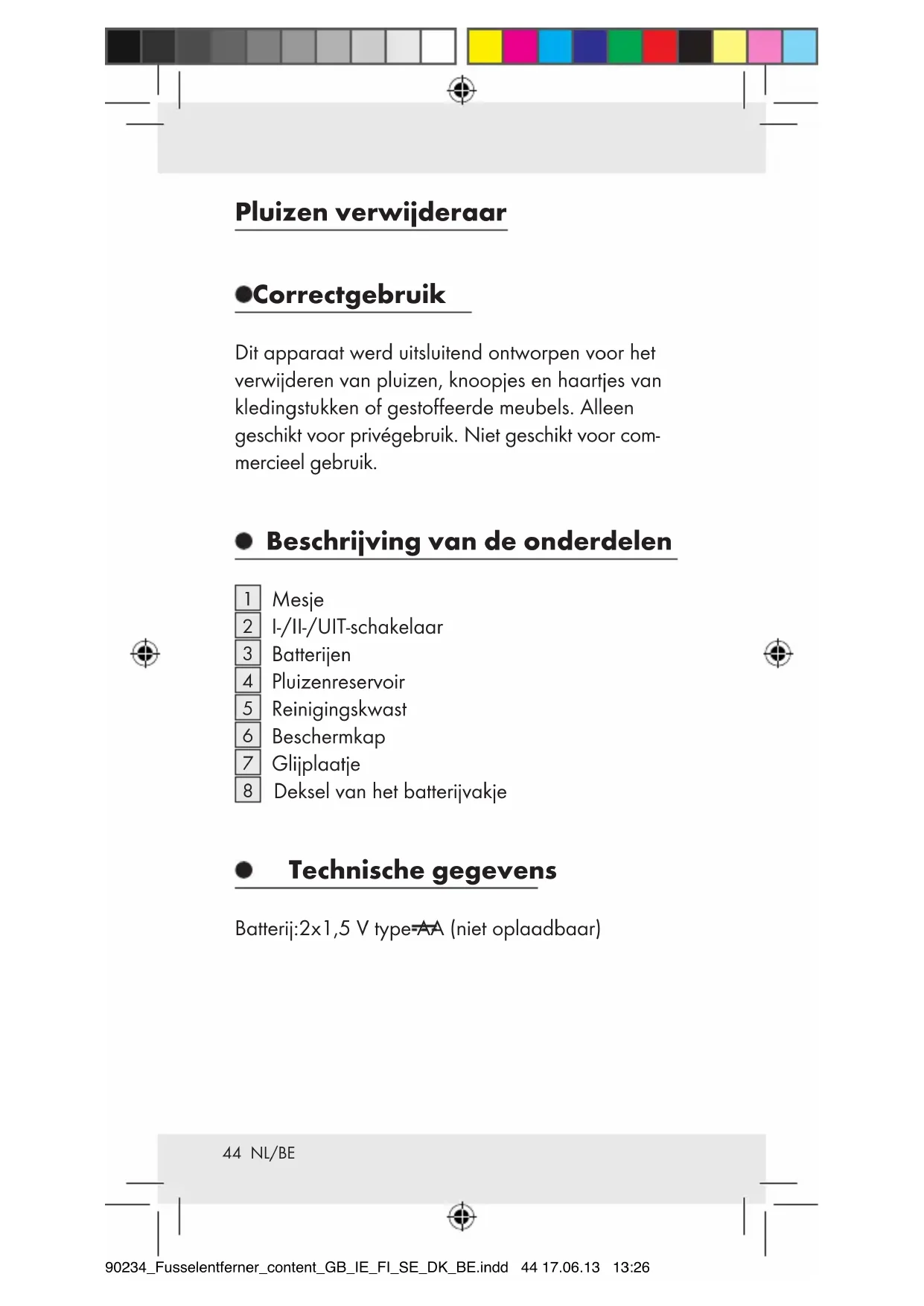 Deksel van het batterijvakje Technische gegevens Batterij: 2 x 1,5V type AA (niet oplaadbaar) 90234_Fusselentferner_content_GB_IE_FI_SE_DK_BE.indd 44 17.06.13 13:2645 NL/BE Veiligheidsinstructies