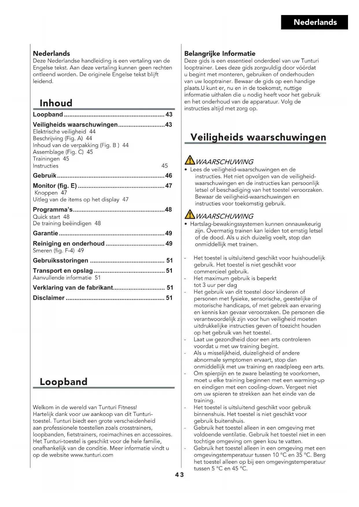 - Avant de plier l’équipement, assurez-vous que l’inclinaison est à 0 %. Si l’inclinaison n’est pas à 0 %, le pliage va endommager le mécanisme. - Déplacez l’équipement comme illustré (fig. F3). Déplacez l’équipement et reposez-le prudemment. Placez l’équipement sur une base protectrice pour éviter d’endommager la surface du sol. Déplacez prudemment l’équipement sur les surfaces irrégulières. Ne déplacez pas l’équipement sur ses roues pour monter des escaliers mais transportez-le par les guidons. - Rangez l’équipement à la verticale (fig. F1). Rangez l’équipement dans un endroit sec exposé à des variations de température minimes. Informations supplémentaires Élimination des emballages Les réglementations gouvernementales nous demandent de réduire la quantité de matériaux déposés dans les décharges. C’est pour cela que nous faisons appel à votre responsabilité et vous demandons de déposer les emballages dans des centres de recyclage publics. Élimination du produit Chez Tunturi, nous espérons que vous profiterez longtemps de votre appareil de fitness. Cependant, nous savons bien qu’un jour ou l’autre votre machine arrivera au terme de sa vie utile. Selon la directive européenne sur les DEEE, vous êtes responsable de vous séparer correctement de votre appareil de fitness en le déposant dans un site public agréé de récupération des déchets.42 Français Déclaration du fabricant Tunturi Fitness BV déclare que le produit est conforme aux directives et normes suivantes : EN 957 (HB), 89/336/CEE. Ce produit porte donc la marque CE. 05-2018 Tunturi New Fitness BV Purmerweg 1 1311 XE Almere Pays-Bas Limite de responsabilité © 2018 Tunturi New Fitness BV Tous les droits réservés. Le produit et le manuel sont sujets à modifications. Les spécifications peuvent hanger sans préavis.43 Nederlands Loopband Welkom in de wereld van Tunturi Fitness!Hartelijk dank voor uw aankoop van dit Tunturi-toestel. Tunturi biedt een grote verscheidenheid aan professionele toestellen zoals crosstrainers, loopbanden, fietstrainers, roeimachines en accessoires. Het Tunturi-toestel is geschikt voor de hele familie, onafhankelijk van de conditie. Meer informatie vindt u op de website www.tunturi.com Nederlands Deze Nederlandse handleiding is een vertaling van de Engelse tekst. Aan deze vertaling kunnen geen rechten ontleend worden. De originele Engelse tekst blijft leidend. Inhoud Loopband .......................................................... 43 Veiligheids waarschuwingen ........................... 43 Elektrische veiligheid 44Beschrijving (Fig. A) 44Inhoud van de verpakking (Fig. B ) 44Assemblage (Fig. C) 45Trainingen 45Instructies 45 Gebruik .............................................................. 46 Monitor (g. E) .................................................. 47 Knoppen 47Uitleg van de items op het display 47 Programma’s ..................................................... 48 Quick start 48De training beëindigen 48 Garantie ............................................................. 49 Reiniging en onderhoud .................................. 49 Smeren (g. F-4) 49 Gebruiksstoringen ........................................... 51 Transport en opslag ......................................... 51 Aanvullende informatie 51 Verklaring van de fabrikant.............................. 51 Disclaimer ......................................................... 51 Belangrijke Informatie Deze gids is een essentieel onderdeel van uw Tunturi looptrainer. Lees deze gids zorgvuldig door vóórdat u begint met monteren, gebruiken of onderhouden van uw looptrainer. Bewaar de gids op een handige plaats.U kunt er, nu en in de toekomst, nuttige informatie uithalen die u nodig heeft voor het gebruik en het onderhoud van de apparatuur. Volg de instructies altijd met zorg op. Veiligheids waarschuwingen WAARSCHUWING