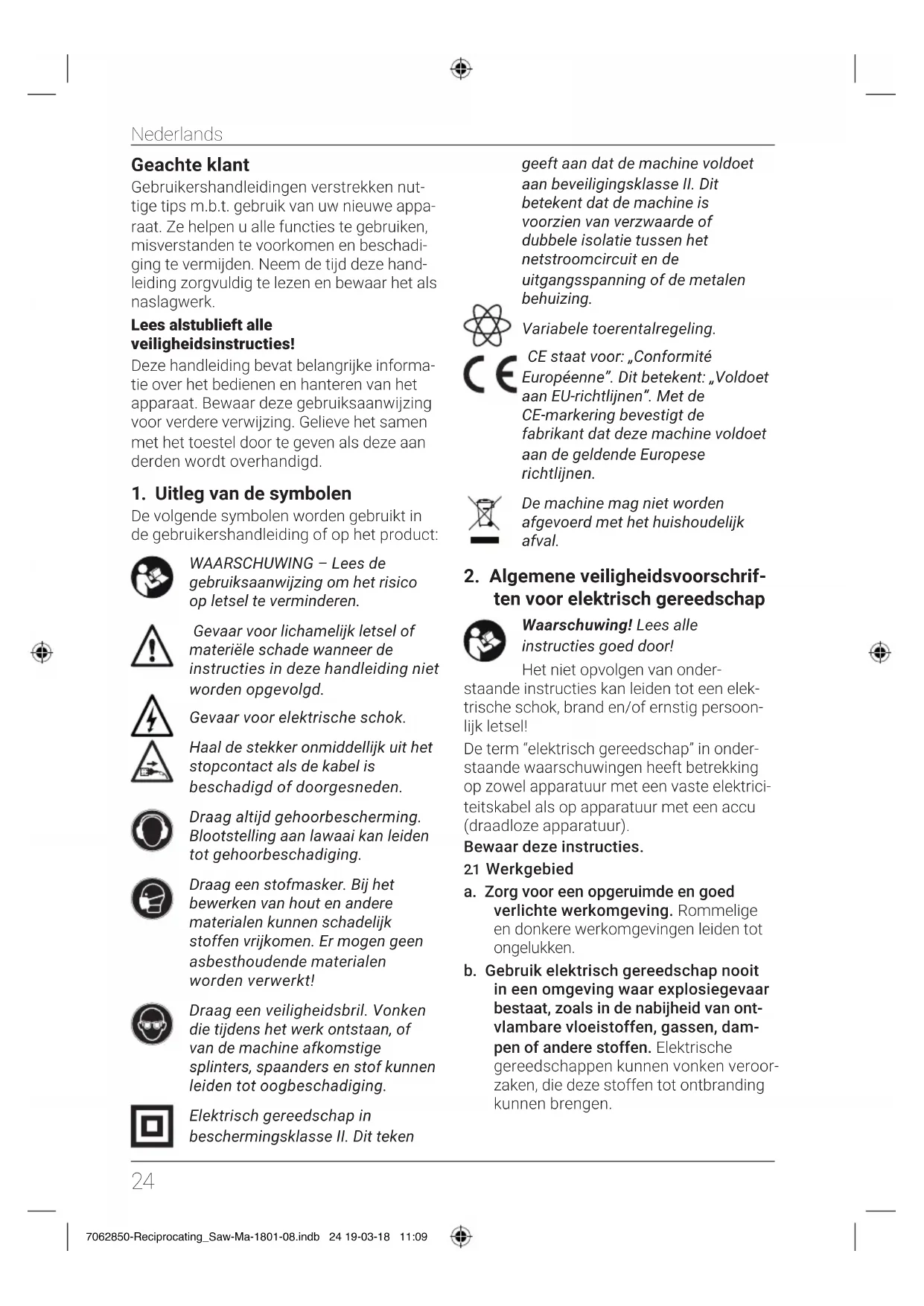 a. Blijf altijd alert, kijk goed wat u doet en gebruik uw gezonde verstand wanneer u een elektrisch gereedschap gebruikt. Gebruik geen elektrische gereedschappen wanneer u moe bent, of drugs, alcohol of medicijnen hebt gebruikt. Eén moment van onacht- zaamheid bij het gebruik van elektrische gereedschappen kan ernstige verwon- dingen tot gevolg hebben. b. Gebruik veiligheidsvoorzieningen. Draag altijd een veiligheidsbril. Een gepast gebruik van veiligheidsvoorzie- ningen, zoals een stof-masker, speciale werkschoenen met antislip-zolen, een veiligheidshelm en gehoor-bescherming verkleinen de kans op persoonlijk letsel. c. Voorkom dat het gereedschap per ongeluk wordt gestart. Zorg dat de schakelaar op de UIT-positie staat, voordat u de stekker in het stopcon- tact steekt. Draag elektrisch gereed- schap nooit met uw vinger op de scha- kelaar en steek ook nooit de stekker van ingeschakelde elektrische gereed- schappen in het stopcontact: dit leidt tot ongelukken. d. Verwijder alle instel - en andere sleu- tels uit het elektrisch gereedschap voordat u hem inschakelt. Instel - en andere sleutels aan een ronddraaiend onderdeel van het elektrisch gereed- schap kunnen tot verwondingen leiden. e. Zorg dat u nooit uw evenwicht kunt verliezen; houd altijd twee voeten stevig op de vloer. Hierdoor kunt u het elektrisch gereedschap in onverwachte situaties beter onder controle houden. f. Zorg dat u geschikte kleding draagt. Draag geen loshangende kleding of sieraden. Houd uw haar, kleding en handschoenen uit de buurt van bewe- gende delen. Loshangende kleding, sieraden en lang haar kunnen vast komen te zitten in bewegende delen. g. Wanneer er voorzieningen zijn voor de aansluiting van stofafzuiginstallaties, zorg dan dat ze op de juiste wijze wor- den aangesloten en gebruikt. Gebruik van deze voorzieningen vermindert de gevaren die door stof worden veroorzaakt. 7062850-Reciprocating_Saw-Ma-1801-08.indb 25 19-03-18 11:09Nederlands