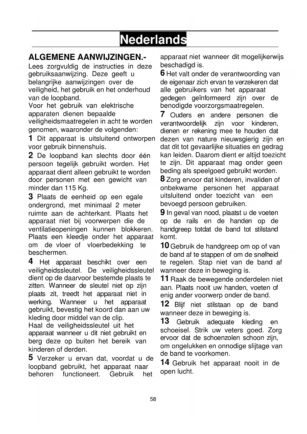 De loopband kan slechts door één persoon tegelijk gebruikt worden. Het apparaat dient alleen gebruikt te worden door personen met een gewicht van minder dan 115 Kg.