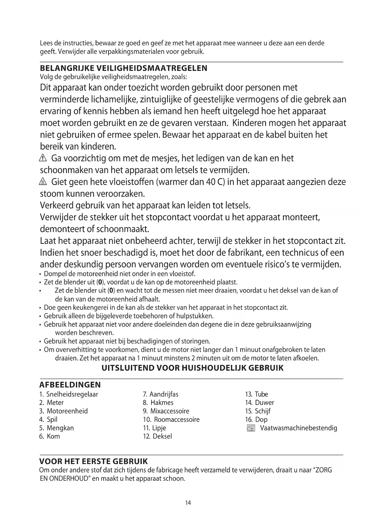 AE14 Lees de instructies, bewaar ze goed en geef ze met het apparaat mee wanneer u deze aan een derde geeft. Verwijder alle verpakkingsmaterialen voor gebruik. BELANGRIJKE VEILIGHEIDSMAATREGELEN Volg de gebruikelijke veiligheidsmaatregelen, zoals: Dit apparaat kan onder toezicht worden gebruikt door personen met verminderde lichamelijke, zintuiglijke of geestelijke vermogens of die gebrek aan ervaring of kennis hebben als iemand hen heeft uitgelegd hoe het apparaat moet worden gebruikt en ze de gevaren verstaan. Kinderen mogen het apparaat niet gebruiken of ermee spelen. Bewaar het apparaat en de kabel buiten het bereik van kinderen. c Ga voorzichtig om met de mesjes, het ledigen van de kan en het schoonmaken van het apparaat om letsels te vermijden. h Giet geen hete vloeistoen (warmer dan 40 C) in het apparaat aangezien deze stoom kunnen veroorzaken. Verkeerd gebruik van het apparaat kan leiden tot letsels. Verwijder de stekker uit het stopcontact voordat u het apparaat monteert, demonteert of schoonmaakt. Laat het apparaat niet onbeheerd achter, terwijl de stekker in het stopcontact zit. Indien het snoer beschadigd is, moet het door de fabrikant, een technicus of een ander deskundig persoon vervangen worden om eventuele risico’s te vermijden.