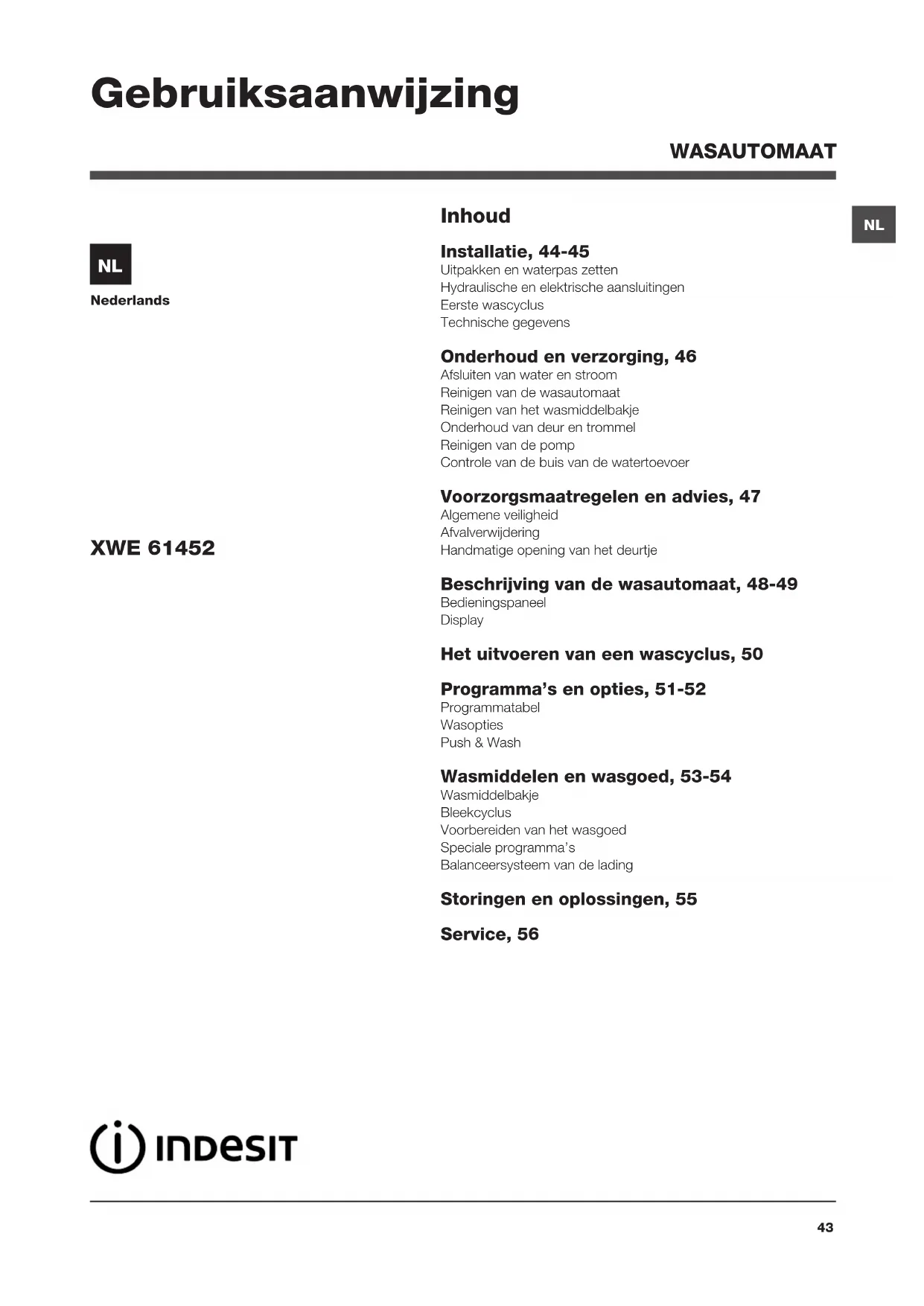 WASAUTOMAAT Inhoud Installatie, 44-45 Uitpakken en waterpas zetten Hydraulische en elektrische aansluitingen Eerste wascyclus Technische gegevens Onderhoud en verzorging, 46 Afsluiten van water en stroom Reinigen van de wasautomaat Reinigen van het wasmiddelbakje Onderhoud van deur en trommel Reinigen van de pomp Controle van de buis van de watertoevoer Voorzorgsmaatregelen en advies, 47 Algemene veiligheid Afvalverwijdering Handmatige opening van het deurtje Beschrijving van de wasautomaat, 48-49 Bedieningspaneel Display Het uitvoeren van een wascyclus, 50 Programma’s en opties, 51-52 Programmatabel Wasopties Push & Wash Wasmiddelen en wasgoed, 53-54 Wasmiddelbakje Bleekcyclus Voorbereiden van het wasgoed Speciale programma’s Balanceersysteem van de lading Storingen en oplossingen, 55 Service, 56 XWE 61452 Gebruiksaanwijzing44