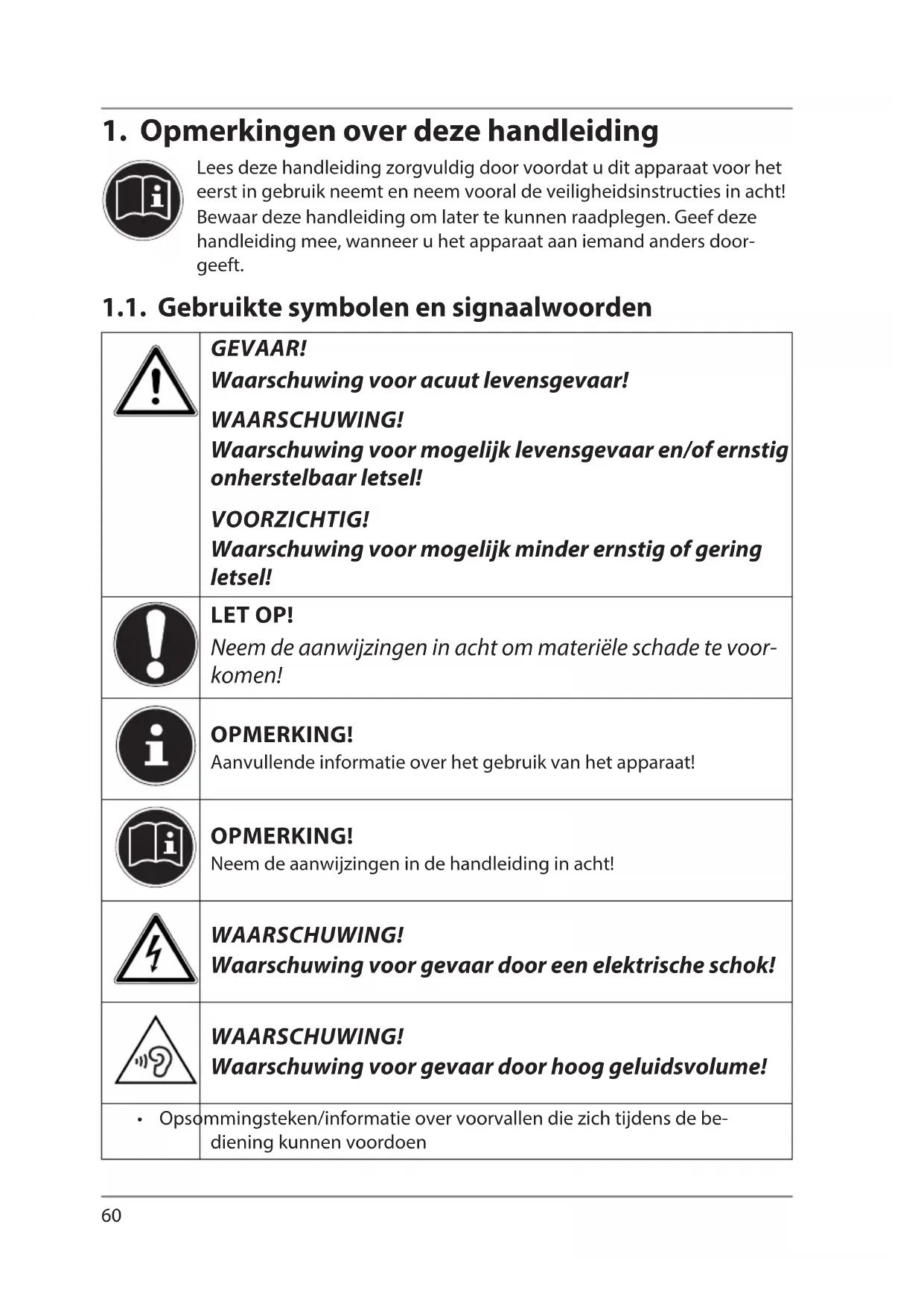 Lees deze handleiding zorgvuldig door voordat u dit apparaat voor het eerst in gebruik neemt en neem vooral de veiligheidsinstructies in acht! Bewaar deze handleiding om later te kunnen raadplegen. Geef deze handleiding mee, wanneer u het apparaat aan iemand anders door- geeft. 1.1. Gebruikte symbolen en signaalwoorden GEVAAR! Waarschuwing voor acuut levensgevaar! WAARSCHUWING! Waarschuwing voor mogelijk levensgevaar en/of ernstig onherstelbaar letsel! VOORZICHTIG! Waarschuwing voor mogelijk minder ernstig of gering letsel! LET OP! Neem de aanwijzingen in acht om materiële schade te voor- komen! OPMERKING! Aanvullende informatie over het gebruik van het apparaat! OPMERKING! Neem de aanwijzingen in de handleiding in acht! WAARSCHUWING! Waarschuwing voor gevaar door een elektrische schok! WAARSCHUWING! Waarschuwing voor gevaar door hoog geluidsvolume!