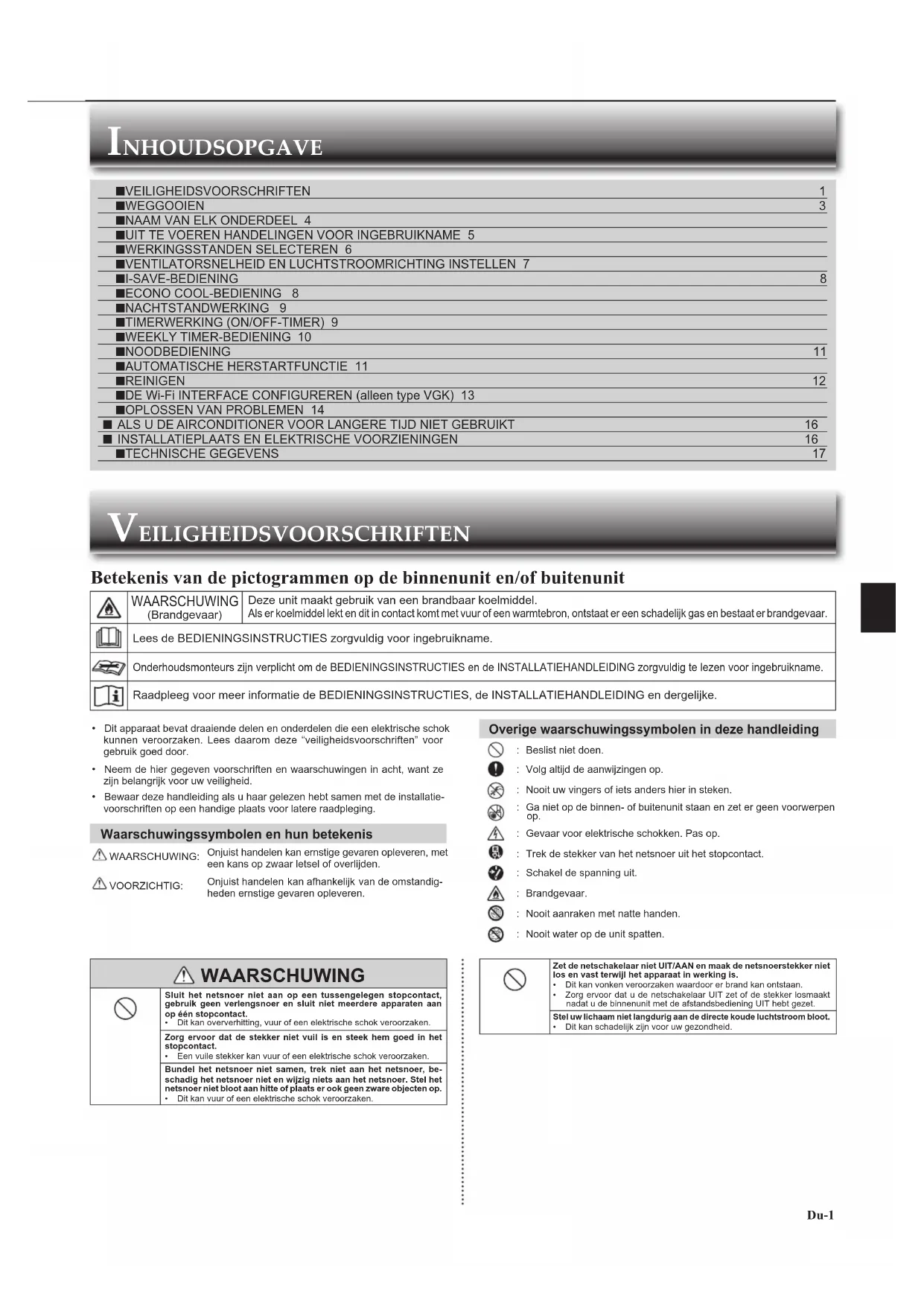 - Neem de hier gegeven voorschriften en waarschuwingen in acht, want ze zijn belangrijk voor uw veiligheid.• Bewaar deze handleiding als u haar gelezen hebt samen met de installatie-voorschriften op een handige plaats voor latere raadpleging. Waarschuwingssymbolen en hun betekenis WAARSCHUWING:Onjuist handelen kan ernstige gevaren opleveren, met een kans op zwaar letsel of overlijden. VOORZICHTIG:Onjuist handelen kan afhankelijk van de omstandig-heden ernstige gevaren opleveren. Overige waarschuwingssymbolen in deze handleiding : Beslist niet doen. : Volg altijd de aanwijzingen op. : Nooit uw vingers of iets anders hier in steken. : Ga niet op de binnen- of buitenunit staan en zet er geen voorwerpen op. : Gevaar voor elektrische schokken. Pas op. : Trek de stekker van het netsnoer uit het stopcontact. : Schakel de spanning uit. : Brandgevaar. : Nooit aanraken met natte handen. : Nooit water op de unit spatten. Betekenis van de pictogrammen op de binnenunit en/of buitenunit WAARSCHUWING (Brandgevaar)Deze unit maakt gebruik van een brandbaar koelmiddel. Als er koelmiddel lekt en dit in contact komt met vuur of een warmtebron, ontstaat er een schadelijk gas en bestaat er brandgevaar. Lees de BEDIENINGSINSTRUCTIES zorgvuldig voor ingebruikname. Onderhoudsmonteurs zijn verplicht om de BEDIENINGSINSTRUCTIES en de INSTALLATIEHANDLEIDING zorgvuldig te lezen voor ingebruikname. Raadpleeg voor meer informatie de BEDIENINGSINSTRUCTIES, de INSTALLATIEHANDLEIDING en dergelijke.Zet de netschakelaar niet UIT/AAN en maak de netsnoerstekker niet los en vast terwijl het apparaat in werking is.• Dit kan vonken veroorzaken waardoor er brand kan ontstaan.