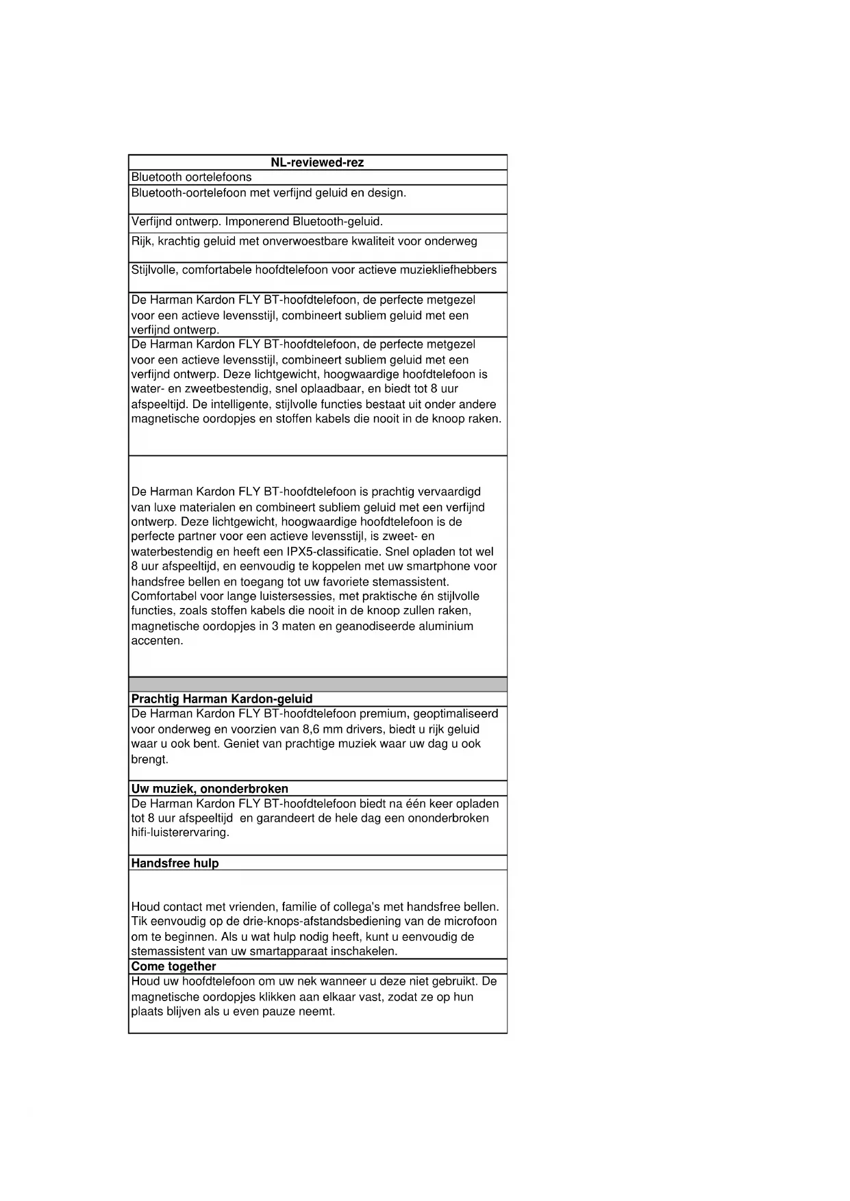 - Peso: 17,1 gNL-reviewed-rez Bluetooth oortelefoons Bluetooth-oortelefoon met verfijnd geluid en design. Verfijnd ontwerp. Imponerend Bluetooth-geluid. Rijk, krachtig geluid met onverwoestbare kwaliteit voor onderweg Stijlvolle, comfortabele hoofdtelefoon voor actieve muziekliefhebbers De Harman Kardon FLY BT-hoofdtelefoon, de perfecte metgezel voor een actieve levensstijl, combineert subliem geluid met een verfijnd ontwerp. De Harman Kardon FLY BT-hoofdtelefoon, de perfecte metgezel voor een actieve levensstijl, combineert subliem geluid met een verfijnd ontwerp. Deze lichtgewicht, hoogwaardige hoofdtelefoon is water- en zweetbestendig, snel oplaadbaar, en biedt tot 8 uur afspeeltijd. De intelligente, stijlvolle functies bestaat uit onder andere magnetische oordopjes en stoffen kabels die nooit in de knoop raken. De Harman Kardon FLY BT-hoofdtelefoon is prachtig vervaardigd van luxe materialen en combineert subliem geluid met een verfijnd ontwerp. Deze lichtgewicht, hoogwaardige hoofdtelefoon is de perfecte partner voor een actieve levensstijl, is zweet- en waterbestendig en heeft een IPX5-classificatie. Snel opladen tot wel 8 uur afspeeltijd, en eenvoudig te koppelen met uw smartphone voor handsfree bellen en toegang tot uw favoriete stemassistent. Comfortabel voor lange luistersessies, met praktische én stijlvolle functies, zoals stoffen kabels die nooit in de knoop zullen raken, magnetische oordopjes in 3 maten en geanodiseerde aluminium accenten. Prachtig Harman Kardon-geluid De Harman Kardon FLY BT-hoofdtelefoon premium, geoptimaliseerd voor onderweg en voorzien van 8,6 mm drivers, biedt u rijk geluid waar u ook bent. Geniet van prachtige muziek waar uw dag u ook brengt. Uw muziek, ononderbroken De Harman Kardon FLY BT-hoofdtelefoon biedt na één keer opladen tot 8 uur afspeeltijd en garandeert de hele dag een ononderbroken hifi-luisterervaring. Handsfree hulp Houd contact met vrienden, familie of collega's met handsfree bellen. Tik eenvoudig op de drie-knops-afstandsbediening van de microfoon om te beginnen. Als u wat hulp nodig heeft, kunt u eenvoudig de stemassistent van uw smartapparaat inschakelen. Come together Houd uw hoofdtelefoon om uw nek wanneer u deze niet gebruikt. De magnetische oordopjes klikken aan elkaar vast, zodat ze op hun plaats blijven als u even pauze neemt.Nooit meer in de knoop Bevrijd uzelf van verstrengelde oortelefoonkabels. De hoogwaardige stoffen kabel is comfortabel en raakt niet in de knoop. Zo kunt u dus meer tijd besteden aan het luisteren naar uw muziek en minder aan het ontwarren van kabels. Veilig en wel Neem de Harman Kardon FLY BT-hoofdtelefoon mee op vakantie, naar de sportschool of naar uw werk. Het compacte, zachte draagtasje zorgt ervoor dat hij beschermd blijft. Werkt met uw favoriete stemassistent Hulp nodig? Gewoon vragen. Harman Kardon FLY BT-hoofdtelefoon staat de hele dag voor u klaar dankzij de de spraakassistent van uw smartphone, u krijgt ondersteuning wanneer en waar u het nodig hebt. Harman Kardon FLY BT draagtasje oordopjes Oplaadkabel 1 x garantie / waarschuwingsblad (W /!) 1 x snelstartgids / veiligheidsblad (S / i)