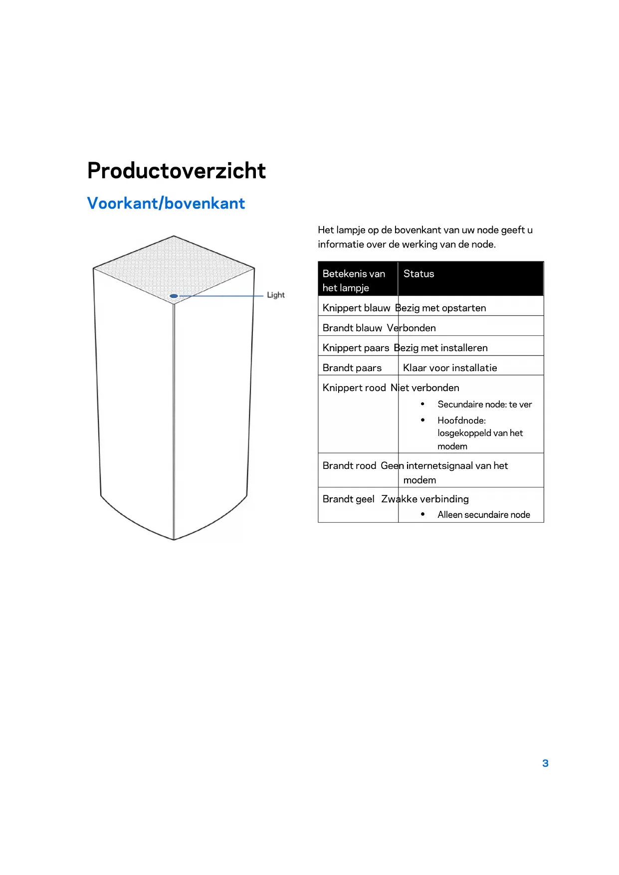 Zorg dat de stekker in het stopcontact zit en uw node is ingeschakeld. Houd de resetknop aan de onderkant ingedrukt. Het lampje op de bovenkant van de node wordt rood en gaat stapsgewijs uit. Laat de knop pas los als het lampje uit is gegaan en vervolgens helderrood is geworden.33 Specificaties Linksys Velop Productnaam Velop (tri-band) Artikelnummer MX5300 Switchpoortsnelheid 10/100/1000 Mbps Radiofrequentie 2,4 GHz en 5 GHz Aantal antennes 13 (intern) Poorten USB 3.0, Ethernet, internet, voeding Knoppen Aan/uit-schakelaar, WPS-knop, resetknop Lampje Één lampje met meerdere kleuren voor voeding en status Beveiligingsfuncties WPA2-Personal, WPA3-Personal Beveiligingssleutel Tot 128-bits versleuteling Omgevingsspecificaties Afmetingen 113 mm x 113 mm x 243 mm Gewicht van het apparaat 1,58 kg Voedingswaarden 12 V, 4 A Certificering FCC, IC, CE, Wi-Fi (IEEE 802.11a/b/g/n/ac, concept 802.11ax ) Bedrijfstemperatuur 0 tot 40 °C Opslagtemperatuur -20 tot 60 °C Luchtvochtigheid tijdens gebruik 10% tot 80% relatieve luchtvochtigheid, niet-condenserend Luchtvochtigheid tijdens opslag 5% tot 90%, niet-condenserend Opmerkingen: Voor wettelijk verplichte informatie, garantie en veiligheidsvoorschriften verwijzen we u naar Linksys.com/support/Velop. Specificaties kunnen zonder kennisgeving worden gewijzigd.34 Maximale prestaties zijn afgeleid van de specificaties van de IEEE 802.11-standaard. De werkelijke prestaties kunnen variëren, met een lagere capaciteit van het draadloze netwerk, lagere gegevensdoorvoersnelheden en een bereik en dekking die kleiner zijn. De prestaties hangen af van talrijke factoren, omstandigheden en variabelen, waaronder de afstand tot het accesspoint, het volume van het netwerkverkeer, bouwmaterialen en constructie, het gebruikte besturingssysteem, de combinatie van gebruikte draadloze producten, interferentie en andere ongunstige omstandigheden. Ga naar linksys.com/support/Velop voor onze bekroonde technische ondersteuning. BELKIN, LINKSYS en veel andere productnamen en logo's zijn handelsmerken van de Belkin- bedrijvengroep. Vermelde handelsmerken van derden zijn eigendom van hun respectieve eigenaars. © 2019 Belkin International, Inc. en/of zijn gelieerde ondernemingen. Alle rechten voorbehouden.1