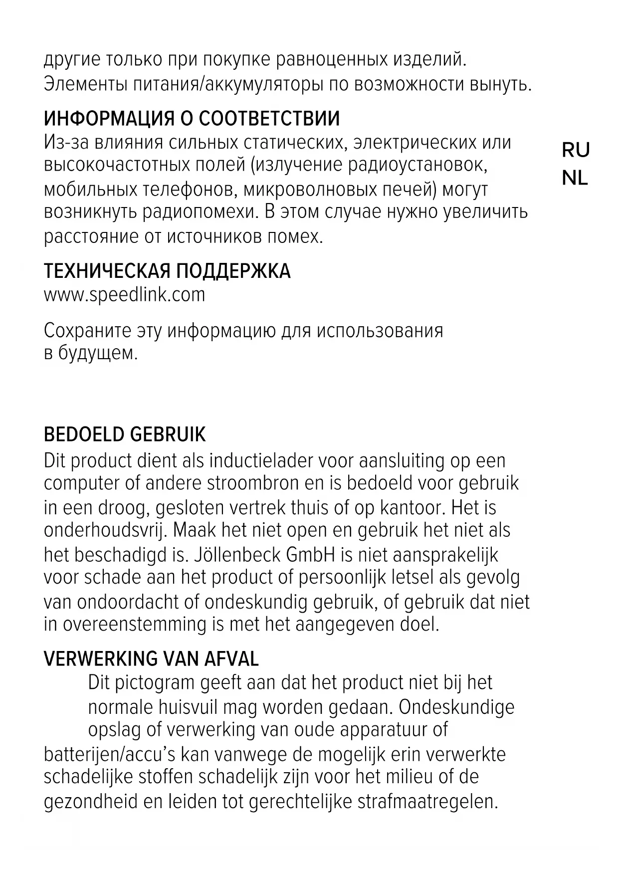 Velden met een sterke statische, elektrische of hoogfrequente lading (radioapparatuur, draadloze telefoons, ontladingen van microgolven) kunnen van invloed zijn op de werking van het apparaat (de apparaten). Probeer in dat geval de afstand tot de storende apparaten te vergroten. TECHNISCHE ONDERSTEUNING www.speedlink.com Bewaar deze informatie voor toekomstige naslag.