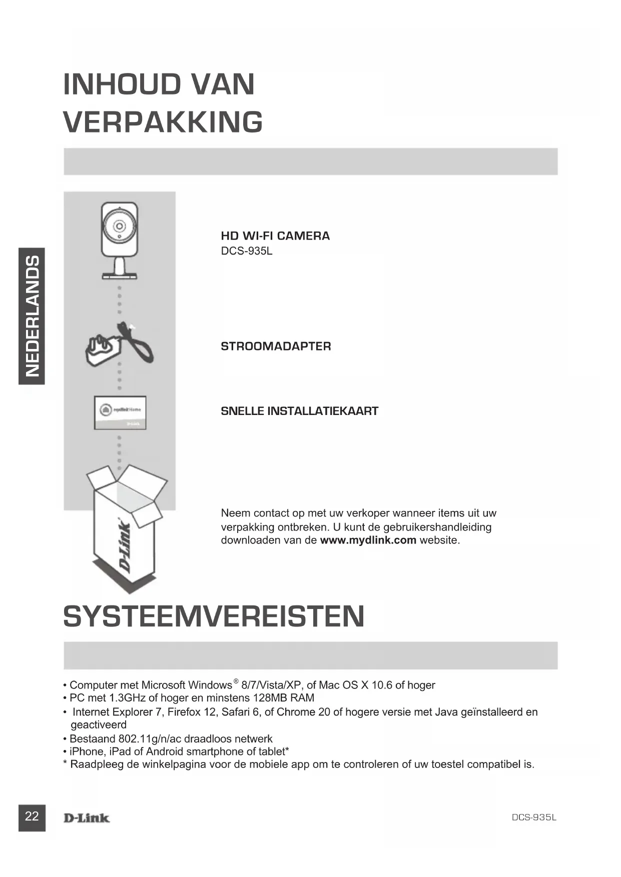 - Raadpleeg de winkelpagina voor de mobiele app om te controleren of uw toestel compatibel is. INHOUD VAN VERPAKKING Neem contact op met uw verkoper wanneer items uit uw verpakking ontbreken. U kunt de gebruikershandleiding downloaden van de www.mydlink.com website.