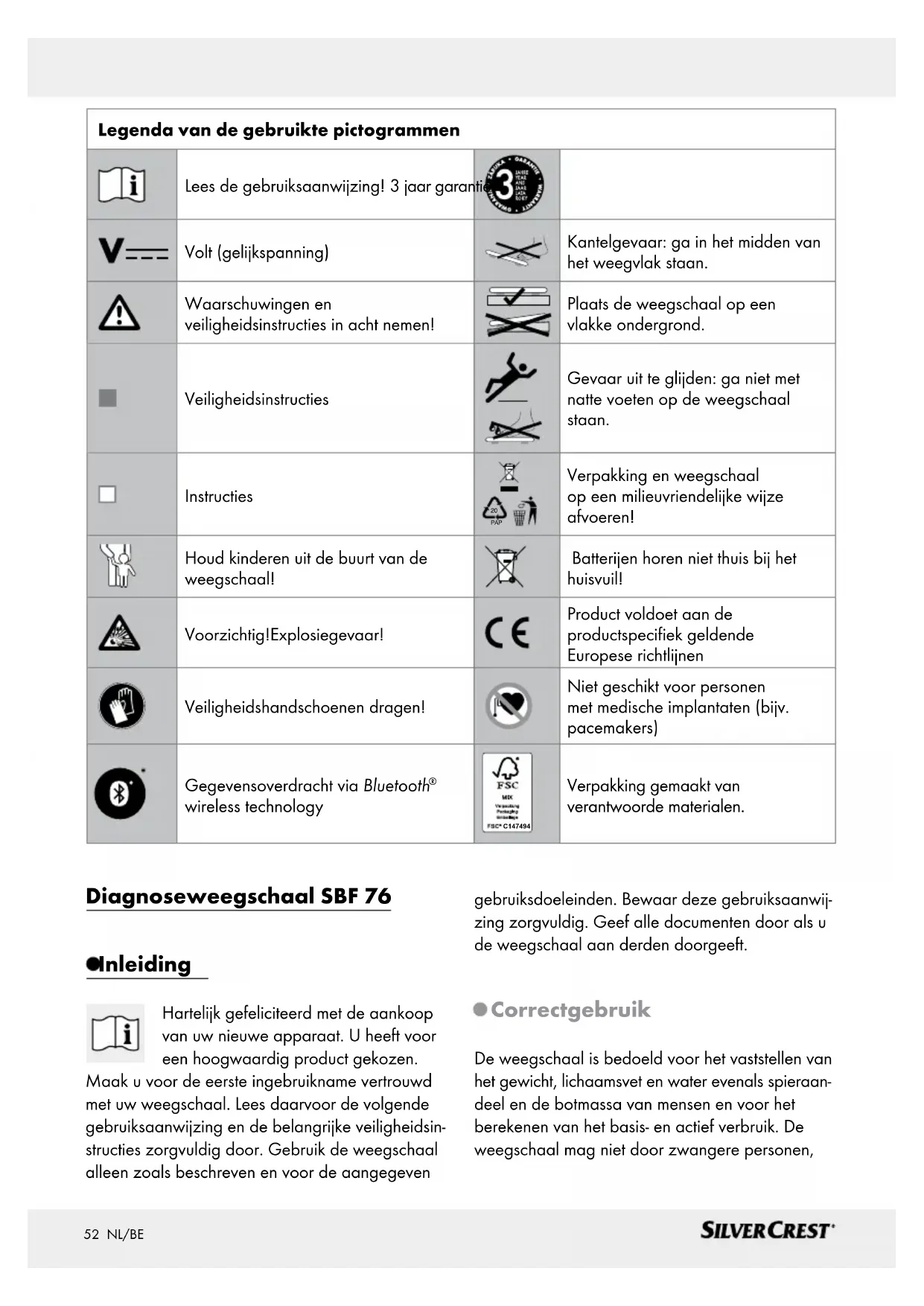 wireless technology C147494 Verpakking gemaakt van verantwoorde materialen. Diagnoseweegschaal SBF 76 Inleiding Hartelijk gefeliciteerd met de aankoop van uw nieuwe apparaat. U heeft voor een hoogwaardig product gekozen. Maak u voor de eerste ingebruikname vertrouwd met uw weegschaal. Lees daarvoor de volgende gebruiksaanwijzing en de belangrijke veiligheidsin- structies zorgvuldig door. Gebruik de weegschaal alleen zoals beschreven en voor de aangegeven gebruiksdoeleinden. Bewaar deze gebruiksaanwij- zing zorgvuldig. Geef alle documenten door als u de weegschaal aan derden doorgeeft. Correct gebruik De weegschaal is bedoeld voor het vaststellen van het gewicht, lichaamsvet en water evenals spieraan- deel en de botmassa van mensen en voor het berekenen van het basis- en actief verbruik. De weegschaal mag niet door zwangere personen,53 NL/BE dialysepatiënten, mensen met oedemen evenals personen met een pacemaker of andere medische implantaten worden gebruikt. De weegschaal is al- leen bedoeld voor eigen gebruik en niet voor com- merciële doeleinden. Een ander gebruik als eerder beschreven of een verandering van de weegschaal is niet toegestaan en kan tot letsel en / of beschadi- ging van de weegschaal leiden. De fabrikant is niet aansprakelijk voor schade die terug te voeren is op onjuist gebruik. De weegschaal is niet bestemd voor commercieel gebruik. Opmerking: de metingen en het advies heeft geen medische relevantie. Indien zich uw lichaams- vet- en wateraandeel continu boven het normbereik bevindt, dient u een arts te consulteren. Beschrijving van de onderdelen