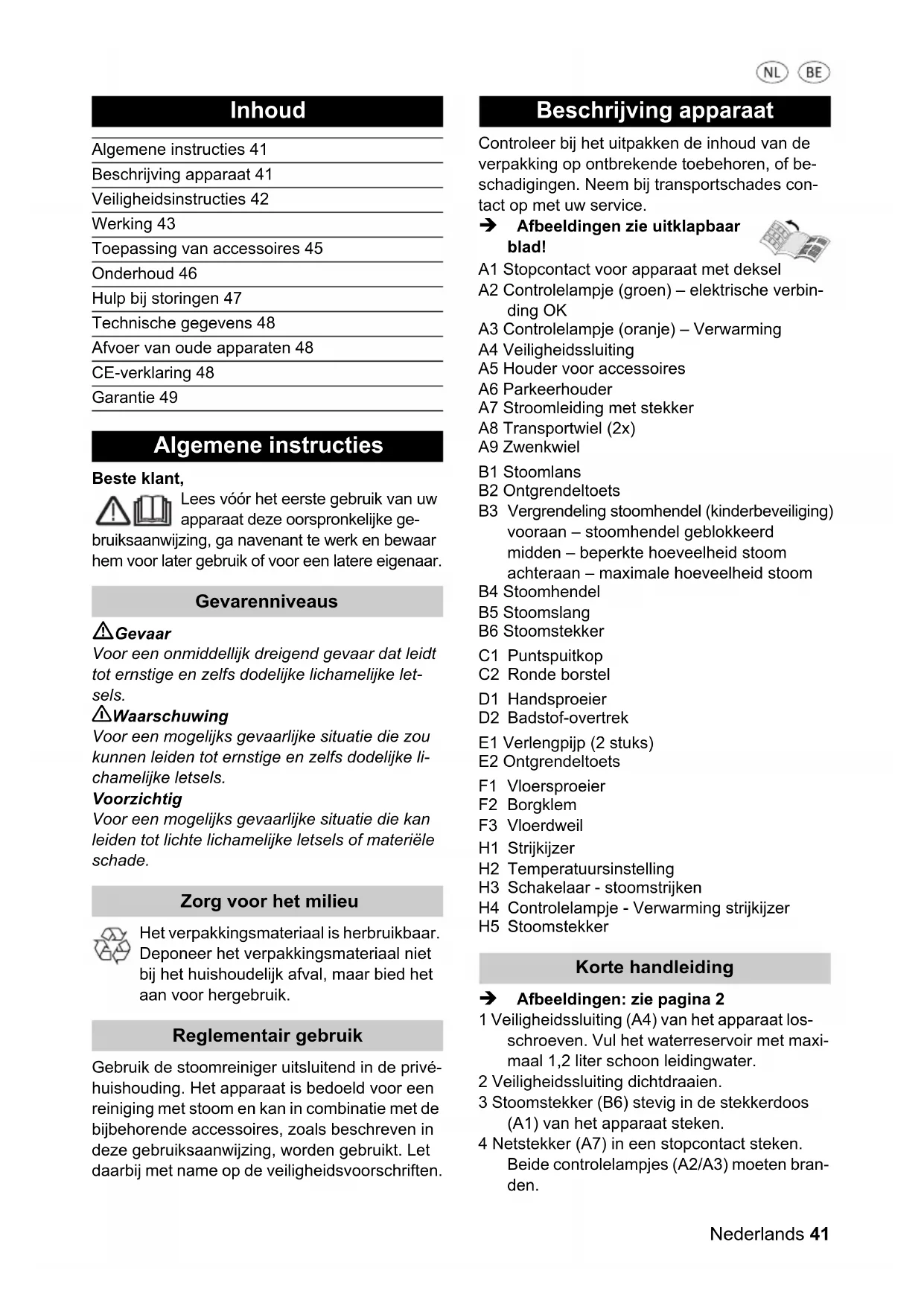 Garanzia Scheda di garanzia Ditta e sede del venditore: Indirizzo centro assistenza: Telefono Hotline: Email: Azienda produttrice / fornitore: Denominazione prodotto: Codice prodotto / produttore: Nome dell'acquirente: C.A.P./Località: Via: Tel. / email: Firma: Descrizione errore:Nederlands 41 Beste klant, Lees vóór het eerste gebruik van uw apparaat deze oorspronkelijke ge- bruiksaanwijzing, ga navenant te werk en bewaar hem voor later gebruik of voor een latere eigenaar. Gevaar Voor een onmiddellijk dreigend gevaar dat leidt tot ernstige en zelfs dodelijke lichamelijke let- sels. 몇 Waarschuwing Voor een mogelijks gevaarlijke situatie die zou kunnen leiden tot ernstige en zelfs dodelijke li- chamelijke letsels. Voorzichtig Voor een mogelijks gevaarlijke situatie die kan leiden tot lichte lichamelijke letsels of materiële schade. Het verpakkingsmateriaal is herbruikbaar. Deponeer het verpakkingsmateriaal niet bij het huishoudelijk afval, maar bied het aan voor hergebruik. Gebruik de stoomreiniger uitsluitend in de privé- huishouding. Het apparaat is bedoeld voor een reiniging met stoom en kan in combinatie met de bijbehorende accessoires, zoals beschreven in deze gebruiksaanwijzing, worden gebruikt. Let daarbij met name op de veiligheidsvoorschriften. Controleer bij het uitpakken de inhoud van de verpakking op ontbrekende toebehoren, of be- schadigingen. Neem bij transportschades con- tact op met uw service. Î Afbeeldingen zie uitklapbaar blad! Î Afbeeldingen: zie pagina 2 1 Veiligheidssluiting (A4) van het apparaat los- schroeven. Vul het waterreservoir met maxi- maal 1,2 liter schoon leidingwater. 2 Veiligheidssluiting dichtdraaien. 3 Stoomstekker (B6) stevig in de stekkerdoos (A1) van het apparaat steken. 4 Netstekker (A7) in een stopcontact steken. Beide controlelampjes (A2/A3) moeten bran- den. Inhoud Algemene instructies 41 Beschrijving apparaat 41 Veiligheidsinstructies 42 Werking 43 Toepassing van accessoires 45 Onderhoud 46 Hulp bij storingen 47 Technische gegevens 48 Afvoer van oude apparaten 48 CE-verklaring 48 Garantie 49 Algemene instructies Gevarenniveaus Zorg voor het milieu Reglementair gebruik Beschrijving apparaat A1 Stopcontact voor apparaat met deksel A2 Controlelampje (groen) – elektrische verbin- ding OK A3 Controlelampje (oranje) – Verwarming A4 Veiligheidssluiting A5 Houder voor accessoires A6 Parkeerhouder A7 Stroomleiding met stekker A8 Transportwiel (2x) A9 Zwenkwiel B1 Stoomlans B2 Ontgrendeltoets B3 Vergrendeling stoomhendel (kinderbeveiliging) vooraan – stoomhendel geblokkeerd midden – beperkte hoeveelheid stoom achteraan – maximale hoeveelheid stoom B4 Stoomhendel B5 Stoomslang B6 Stoomstekker C1 Puntspuitkop C2 Ronde borstel D1 Handsproeier D2 Badstof-overtrek E1 Verlengpijp (2 stuks) E2 Ontgrendeltoets F1 Vloersproeier F2 Borgklem F3 Vloerdweil H1 Strijkijzer H2 Temperatuursinstelling H3 Schakelaar - stoomstrijken H4 Controlelampje - Verwarming strijkijzer H5 Stoomstekker Korte handleiding42 Nederlands 5 Na ca. 8 minuten dooft het oranje controle- lampje (A3). 6 Benodigde accessoires verbinden met het stoompistool (B1). De stoomreiniger is klaar voor gebruik. Gevaar U mag het apparaat niet in gebieden met ex- plosiegevaar gebruiken. Bij het gebruik van het apparaat in gevaarlijk gebied moeten de overeenkomstige veilig- heidsvoorschriften in acht genomen worden. Het apparaat niet in gevulde zwenbaden ge- bruiken. Het apparaat mag niet gebruikt worden voor de reiniging van elektrische toestellen zoals bijvoorbeeld ovens, dampkappen, micro- golfovens, televisietoestellen, lampen, haar- drogers, elektrische verwarmingstoestellen, enz. Het apparaat en de accessoires voor gebruik controleren op reglementaire staat. Indien zij niet in goede staat verkeren, mag u de appa- ratuur niet gebruiken. Gelieve in het bijzon- der de stroomleiding (A7), de veiligheidssluiting (A4) en de stoomslang te controleren (B5). Een beschadigde stroomleiding onmiddellijk laten vervangen door geautoriseerde klan- tendienst / bevoegde electricien. Beschadigde stoomslang onmiddellijk ver- vangen. U mag alleen een door de fabrikant aanbevolen stoomslang gebruiken. Pak de stekker en wandcontactdoos nooit met vochtige handen beet. Geen voorwerpen afstomen die stoffen be- vatten die gevaarlijk zijn voor de gezondheid (bv. asbest). De stoomstraal nooit van dichtbij met de hand aanraken en nooit richten op mensen en dieren (gevaar voor brandwonden). 몇 Waarschuwing U mag het apparaat uitsluitend aansluiten op een wandcontactdoos, die is aangebracht door een elektrotechnische installateur, vol- gens IEC 60364. Gebruik uitsluitend wisselstroom voor het apparaat. De spanning moet overeenkomen met de vermelding op het typeplaatje van het apparaat. In vochtige ruimtes, zoals badkamers, het apparaat aansluiten op een stopcontact met een voorgeschakelde aardlekbeveiliging. Ongeschikte verlengsnoeren kunnen ge- vaarlijk zijn. Uitsluitend een spatwaterdicht verlengsnoer met een doorsnede van mini- maal 3x1 mm² gebruiken. De verbinding van stekker en verlengkabel mag niet in het water liggen. Als er verbindingen met het netsnoer of de verlengkabel worden vervangen, moet er- voor worden gezorgd dat de spatwaterbe- scherming en de mechanische sterkte behouden blijven. De gebruiker moet het apparaat voor het juiste doel gebruiken. De gebruiker moet re- kening houden met de plaatselijke omstan- digheden en speciaal letten op personen die zich in de buurt bevinden. Dit apparaat is niet geschikt om door perso- nen (inclusief kinderen) met beperkte fysie- ke, sensorische of geestelijke vaardigheden of met gebrek aan ervaring en/of kennis ge- bruikt te worden, tenzij ze door een voor hun veiligheid verantwoordelijke persoon in de gaten gehouden worden of van hem aanwij- zingen ontvingen hoe het apparaat gebruikt moet worden. Kinderen dienen in de gaten gehouden te worden om er zeker van te zijn dat ze niet met het apparaat spelen. Laat het apparaat niet zonder toezicht achter zolang het aa