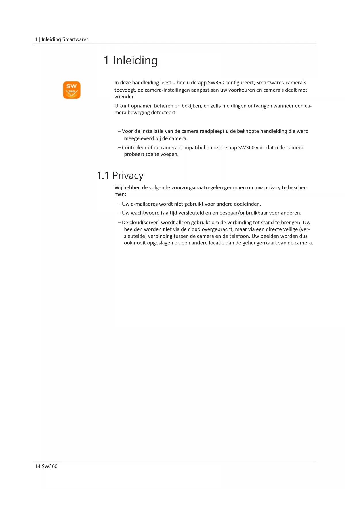 Wij hebben de volgende voorzorgsmaatregelen genomen om uw privacy te bescher- men: – Uw e-mailadres wordt niet gebruikt voor andere doeleinden. – Uw wachtwoord is altijd versleuteld en onleesbaar/onbruikbaar voor anderen. – De cloud(server) wordt alleen gebruikt om de verbinding tot stand te brengen. Uw beelden worden niet via de cloud overgebracht, maar via een directe veilige (ver- sleutelde) verbinding tussen de camera en de telefoon. Uw beelden worden dus ook nooit opgeslagen op een andere locatie dan de geheugenkaart van de camera.Smartwares De app installeren | 2 SW360 15 2 De app installeren Voordat u de camera kunt gebruiken, moet u eerst de app SW360 installeren op uw smartphone. De app SW360 is beschikbaar voor Android- en iOS-apparaten (Apple). a) Open de Apple App Store of de Google Play Store. b) Zoek naar 'SW360'. c) Download en installeer de app. ð U kunt de app SW360 nu gebruiken op uw smartphone.