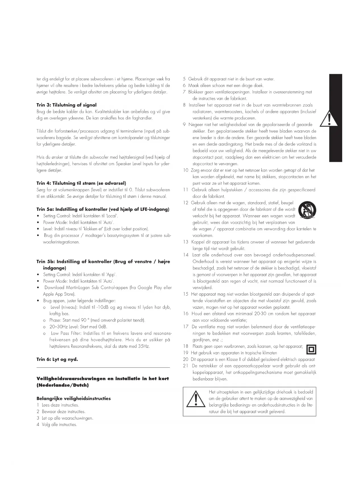 - Brug appen, juster følgende indstillinger: o Level (niveau): Indstil til -10dB og øg niveau til lyden har dyb, kraftig bas. o Phase: Start med 90 ° (med omvendt polaritet tændt). o 20–30Hz Level: Start med 0dB. o Low Pass Filter: Indstilles til en frekvens lavere end resonans- frekvensen på dine hovedhøjttalere. Hvis du er usikker på højttalerens Resonansfrekvens, skal du starte med 35Hz. Trin 6: Lyt og nyd. Veiligheidswaarschuwingen en installatie in het kort (Nederlandse/Dutch) Belangrijke veiligheidsinstructies 1 Lees deze instructies. 2 Bewaar deze instructies. 3 Let op alle waarschuwingen. 4 Volg alle instructies. 5 Gebruik dit apparaat niet in de buurt van water. 6 Maak alleen schoon met een droge doek. 7 Blokkeer geen ventilatieopeningen. Installeer in overeenstemming met de instructies van de fabrikant. 8 Installeer het apparaat niet in de buurt van warmtebronnen zoals radiatoren, warmteroosters, kachels of andere apparaten (inclusief versterkers) die warmte produceren. 9 Negeer niet het veiligheidsdoel van de gepolariseerde of geaarde stekker. Een gepolariseerde stekker heeft twee bladen waarvan de ene breder is dan de andere. Een geaarde stekker heeft twee bladen en een derde aardingstong. Het brede mes of de derde vorktand is bedoeld voor uw veiligheid. Als de meegeleverde stekker niet in uw stopcontact past, raadpleeg dan een elektricien om het verouderde stopcontact te vervangen. 10 Zorg ervoor dat er niet op het netsnoer kan worden getrapt of dat het kan worden afgekneld, met name bij stekkers, stopcontacten en het punt waar ze uit het apparaat komen. 11 Gebruik alleen hulpstukken / accessoires die zijn gespecificeerd door de fabrikant. 12 Gebruik alleen met de wagen, standaard, statief, beugel of tafel die is opgegeven door de fabrikant of die wordt verkocht bij het apparaat. Wanneer een wagen wordt gebruikt, wees dan voorzichtig bij het verplaatsen van de wagen / apparaat combinatie om verwonding door kantelen te voorkomen. 13 Koppel dit apparaat los tijdens onweer of wanneer het gedurende lange tijd niet wordt gebruikt. 14 Laat alle onderhoud over aan bevoegd onderhoudspersoneel. Onderhoud is vereist wanneer het apparaat op enigerlei wijze is beschadigd, zoals het netsnoer of de stekker is beschadigd, vloeistof is gemorst of voorwerpen in het apparaat zijn gevallen, het apparaat is blootgesteld aan regen of vocht, niet normaal functioneert of is verwijderd. 15 Het apparaat mag niet worden blootgesteld aan druipende of spat- tende vloeistoffen en objecten die met vloeistof zijn gevuld, zoals vazen, mogen niet op het apparaat worden geplaatst. 16 Houd een afstand van minimaal 20-30 cm rondom het apparaat aan voor voldoende ventilatie; 17 De ventilatie mag niet worden belemmerd door de ventilatieope- ningen te bedekken met voorwerpen zoals kranten, tafelkleden, gordijnen, enz .;