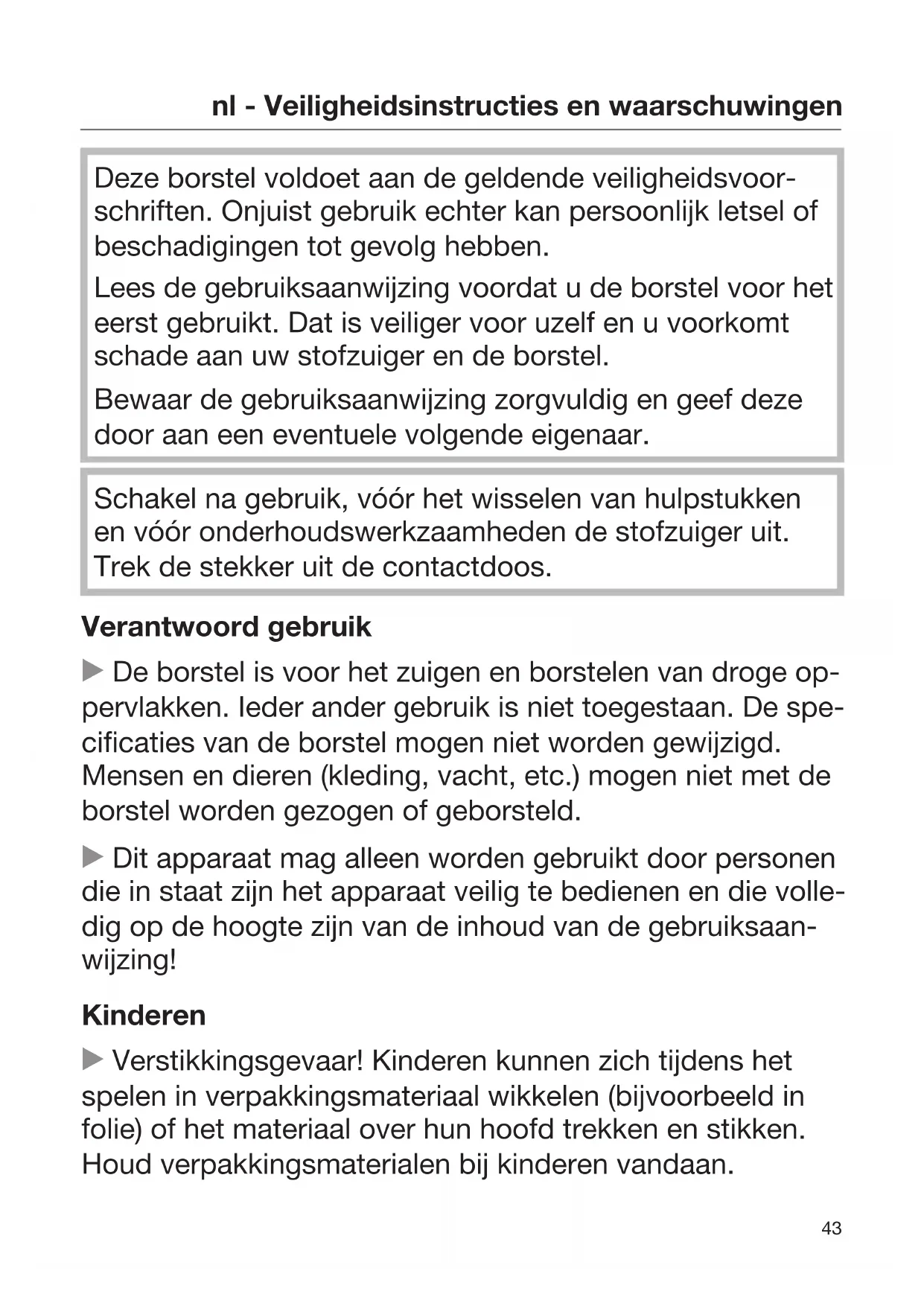Deze borstel voldoet aan de geldende veiligheidsvoor- schriften. Onjuist gebruik echter kan persoonlijk letsel of beschadigingen tot gevolg hebben. Lees de gebruiksaanwijzing voordat u de borstel voor het eerst gebruikt. Dat is veiliger voor uzelf en u voorkomt schade aan uw stofzuiger en de borstel. Bewaar de gebruiksaanwijzing zorgvuldig en geef deze door aan een eventuele volgende eigenaar. Schakel na gebruik, vóór het wisselen van hulpstukken en vóór onderhoudswerkzaamheden de stofzuiger uit. Trek de stekker uit de contactdoos. Verantwoord gebruik De borstel is voor het zuigen en borstelen van droge op- pervlakken. Ieder ander gebruik is niet toegestaan. De spe- cificaties van de borstel mogen niet worden gewijzigd. Mensen en dieren (kleding, vacht, etc.) mogen niet met de borstel worden gezogen of geborsteld. Dit apparaat mag alleen worden gebruikt door personen die in staat zijn het apparaat veilig te bedienen en die volle- dig op de hoogte zijn van de inhoud van de gebruiksaan- wijzing! Kinderen Verstikkingsgevaar! Kinderen kunnen zich tijdens het spelen in verpakkingsmateriaal wikkelen (bijvoorbeeld in folie) of het materiaal over hun hoofd trekken en stikken. Houd verpakkingsmaterialen bij kinderen vandaan.nl - Veiligheidsinstructies en waarschuwingen