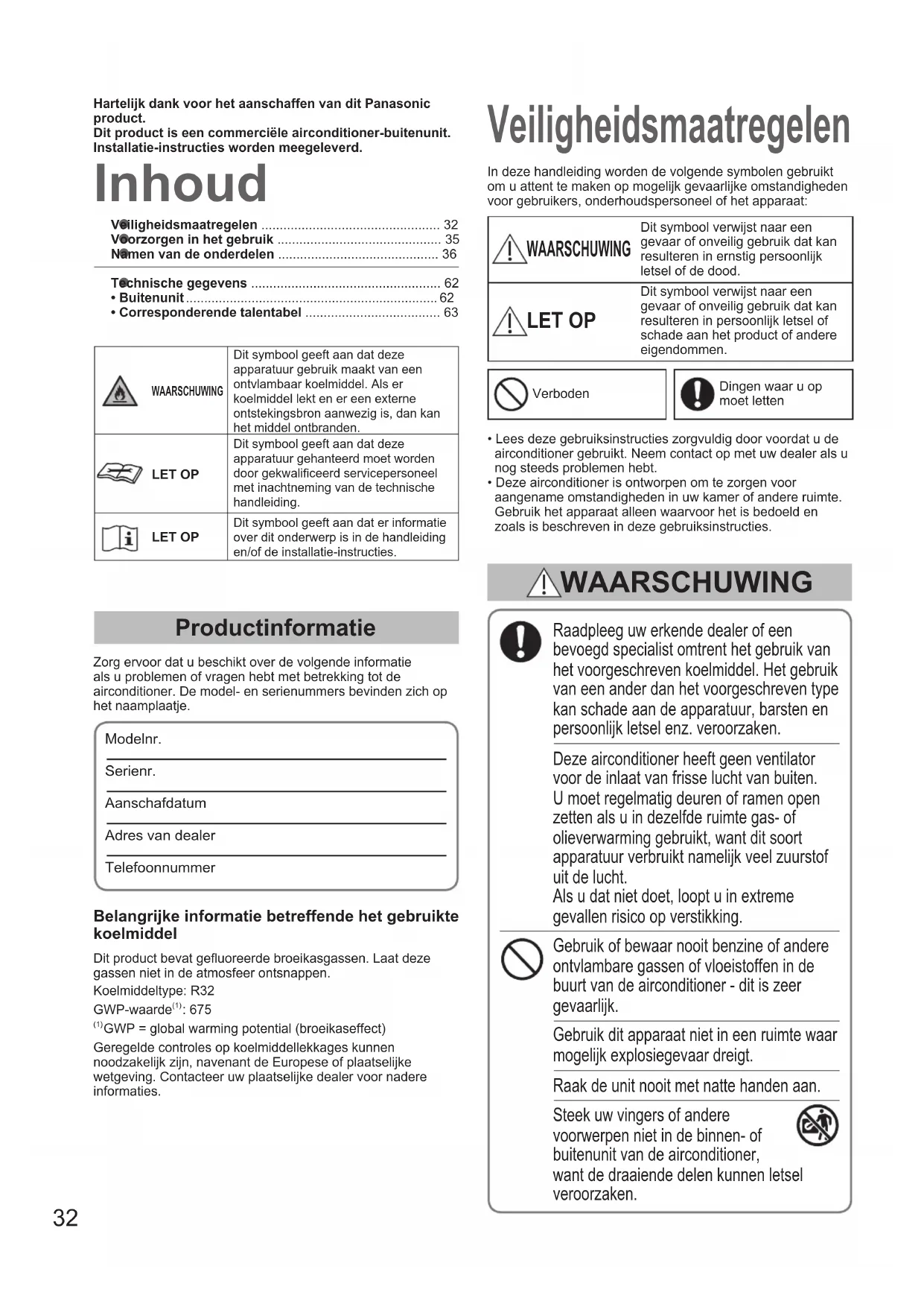 - Corresponderende talentabel ..................................... 63 Inhoud Veiligheidsmaatregelen Productinformatie Zorg ervoor dat u beschikt over de volgende informatie als u problemen of vragen hebt met betrekking tot de airconditioner. De model- en serienummers bevinden zich op het naamplaatje.Modelnr. Serienr. AanschafdatumAdres van dealerTelefoonnummer Raadpleeg uw erkende dealer of een bevoegd specialist omtrent het gebruik van het voorgeschreven koelmiddel. Het gebruik van een ander dan het voorgeschreven type kan schade aan de apparatuur, barsten en persoonlijk letsel enz. veroorzaken. Deze airconditioner heeft geen ventilator voor de inlaat van frisse lucht van buiten. U moet regelmatig deuren of ramen open zetten als u in dezelfde ruimte gas- of olieverwarming gebruikt, want dit soort apparatuur verbruikt namelijk veel zuurstof uit de lucht. Als u dat niet doet, loopt u in extreme gevallen risico op verstikking. Gebruik of bewaar nooit benzine of andere ontvlambare gassen of vloeistoffen in de buurt van de airconditioner - dit is zeer gevaarlijk. Gebruik dit apparaat niet in een ruimte waar mogelijk explosiegevaar dreigt. Raak de unit nooit met natte handen aan. Steek uw vingers of andere voorwerpen niet in de binnen- of buitenunit van de airconditioner, want de draaiende delen kunnen letsel veroorzaken. In deze handleiding worden de volgende symbolen gebruikt om u attent te maken op mogelijk gevaarlijke omstandigheden voor gebruikers, onderhoudspersoneel of het apparaat: WAARSCHUWING Dit symbool verwijst naar een gevaar of onveilig gebruik dat kan resulteren in ernstig persoonlijk letsel of de dood. LET OP Dit symbool verwijst naar een gevaar of onveilig gebruik dat kan resulteren in persoonlijk letsel of schade aan het product of andere eigendommen. WAARSCHUWING Hartelijk dank voor het aanschaffen van dit Panasonic product.Dit product is een commerciële airconditioner-buitenunit.Installatie-instructies worden meegeleverd.VerbodenDingen waar u op moet letten• Lees deze gebruiksinstructies zorgvuldig door voordat u de airconditioner gebruikt. Neem contact op met uw dealer als u nog steeds problemen hebt.• Deze airconditioner is ontworpen om te zorgen voor aangename omstandigheden in uw kamer of andere ruimte. Gebruik het apparaat alleen waarvoor het is bedoeld en zoals is beschreven in deze gebruiksinstructies.WAARSCHUWINGDit symbool geeft aan dat deze apparatuur gebruik maakt van een ontvlambaar koelmiddel. Als er koelmiddel lekt en er een externe ontstekingsbron aanwezig is, dan kan het middel ontbranden.LET OPDit symbool geeft aan dat deze apparatuur gehanteerd moet worden door gekwaliceerd servicepersoneel met inachtneming van de technische handleiding.LET OPDit symbool geeft aan dat er informatie over dit onderwerp is in de handleiding en/of de installatie-instructies.Belangrijke informatie betreffende het gebruikte koelmiddelDit product bevat geuoreerde broeikasgassen. Laat deze gassen niet in de atmosfeer ontsnappen.Koelmiddeltype: R32GWP-waarde (1) : 675 (1) GWP = global warming potential (broeikaseffect)Geregelde controles op koelmiddellekkages kunnen noodzakelijk zijn, navenant de Europese of plaatselijke wetgeving. Contacteer uw plaatselijke dealer voor nadere informaties. OI_00_302355_all.indb 32 2018/9/20 10:01:3733 NEDERLANDS WAARSCHUWING Als het koelmiddel in contact komt met vuur, zal dit een giftig gas produceren. Zorg er om veiligheidsredenen voor dat u de airconditioner uitschakelt en ook de stekker uit het stopcontact haalt voordat u het apparaat reinigt of onderhoud pleegt. Trek in geval van nood de stekker van het netsnoer uit het stopcontact of schakel de stroomonderbreker uit, of schakel de hoofdschakelaar uit om de airconditioner volledig los te koppelen van de netstroom. Verwijderen in overeenstemming met landelijke en/of plaatselijke regelgeving. Dit product mag in geen geval worden gewijzigd of gedemonteerd. Een gewijzigde of gedemonteerde unit kan leiden tot brand, elektrische schokken, of letsel. Reinig nooit zelf het binnenste van de binnen- en buitenunits. Laat de reiniging uitvoeren door een bevoegde dealer of specialist. Repareer bij storingen dit apparaat niet zelf. Neem voor reparatie en verwijdering contact op met uw dealer of reparateur. Gebruik geen aangepaste snoeren, snoeren die gedeeld worden met andere apparatuur, verlengsnoeren of snoeren die niet aan de specicaties voldoen om oververhitting en brand te vermijden. Zorg voor een apart stopcontact dat uitsluitend bestemd is voor elk individueel toestel en een stroomonderbreker, aardlekschakelaar of verliesstroomschakelaar ter beveiliging tegen te hoge stromen in de uitsluitend voor de apparatuur bestemde stroomleiding. Zorg voor een apart stopcontact voor elke unit en zorg ervoor dat conform de regelgeving voor elektrische bedrading er volledige ontkoppeling, dat wil zeggen een ontkoppeling van het stopcontact in alle polen, wordt geïmplementeerd in de vaste bedrading. Ter voorkoming van mogelijke gevaren vanwege defecte isolatie moet de unit worden geaard. Het toestel moet worden bewaard in een ruimte waarin zich geen doorlopend werkende ontstekingsbronnen bevinden (bijvoorbeeld: open vuur, een werkend gasapparaat, of een werkend elkektrisch verwarmingstoestel). Let op, want koelmiddel kan geurloos zijn. Een ongeventileerde plek waar een toestel dat gebruik maakt van ontvlambare koelmiddelen wordt geïnstalleerd, moet zo zijn geconstrueerd dat het koelmiddel in geval van een lekkage niet kan blijven staan zodat er brandgevaar en ontplofngsgevaar ontstaat. Het toestel moet worden bewaard op een goed geventileerde plek en de afmetingen van de ruimte moeten overeenkomen met de afmetingen van de ruimte waarin het toestel volgens de specicaties gebruikt moet worden. Nadat installatie van de unit bent u verplicht de installateur te vragen naar het vloeroppervlak van de ruimte waarin de unit is aangebracht en de hoeveelheid koelmiddel in het systeem. Als de unit of de indeling van d