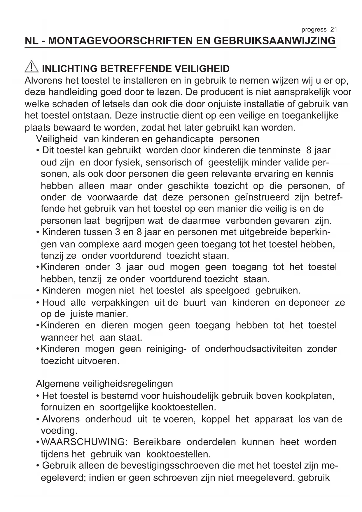 - Gebruik alleen de bevestigingsschroeven die met het toestel zijn me- egeleverd; indien er geen schroeven zijn niet meegeleverd, gebruik22 progress de schroeven die in de installatie instructie aanbevolen worden.